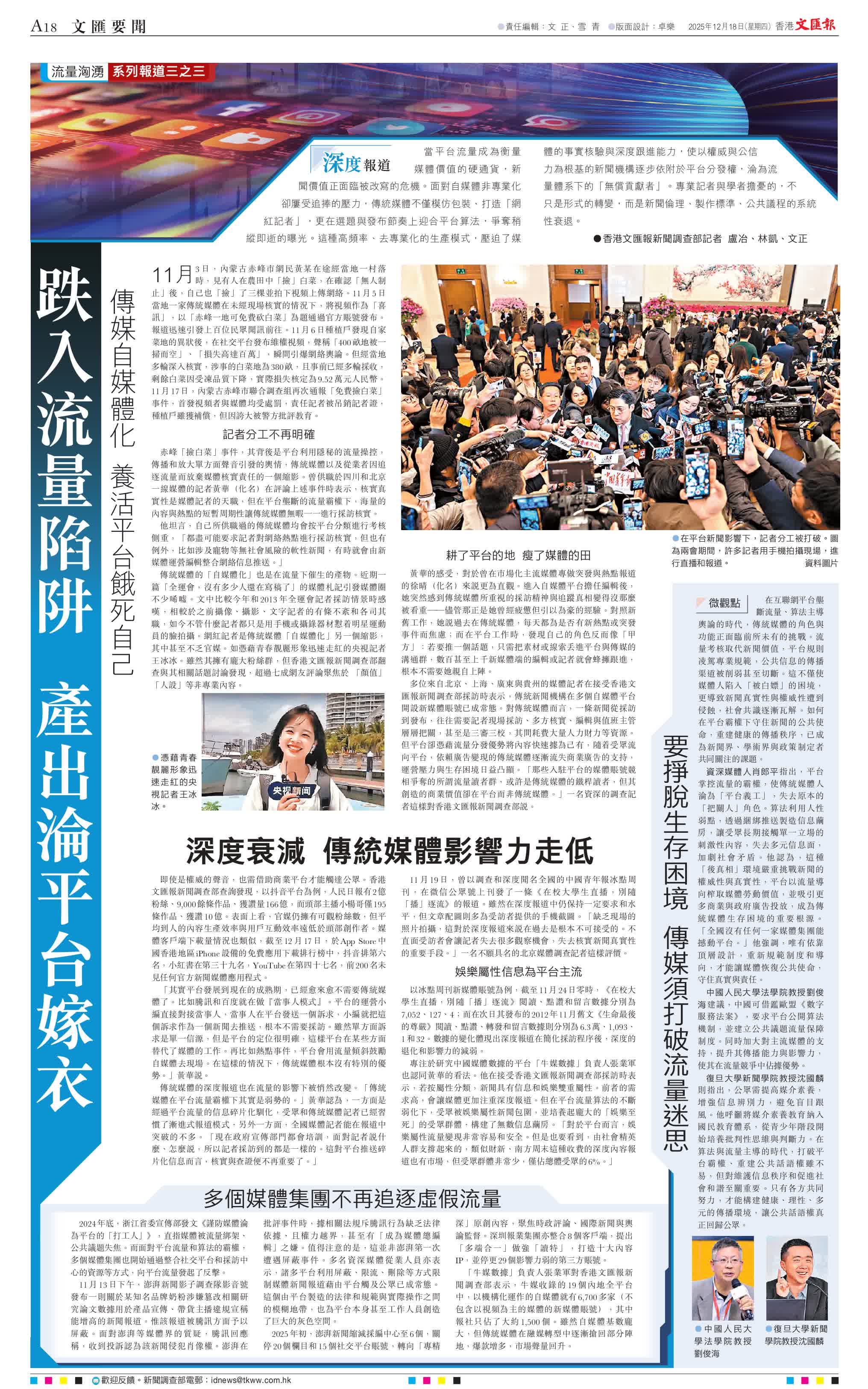 香港文匯報訊(新聞調查部記者 盧冶、林凱、文正)當平台流量成為衡量媒體價值的硬通貨,新聞價值正面臨被改寫的危機。面對自媒體非專業化卻屢受追捧的壓力,傳統媒體不僅模仿包裝、打造「網紅記者」,更在選題與發布節奏上迎合平台算法,爭奪稍縱即逝的曝光。這種高頻率、去專業化的生產模式,壓迫了媒體的事實核驗與深度跟進能力,使以權威與公信力為根基的新聞機構逐步依附於平台分發權,淪為流量體系下的「無償貢獻者」。專業記者與學者擔憂的,不只是形式的轉變,而是新聞倫理、製作標準、公共議程的系統性衰退。