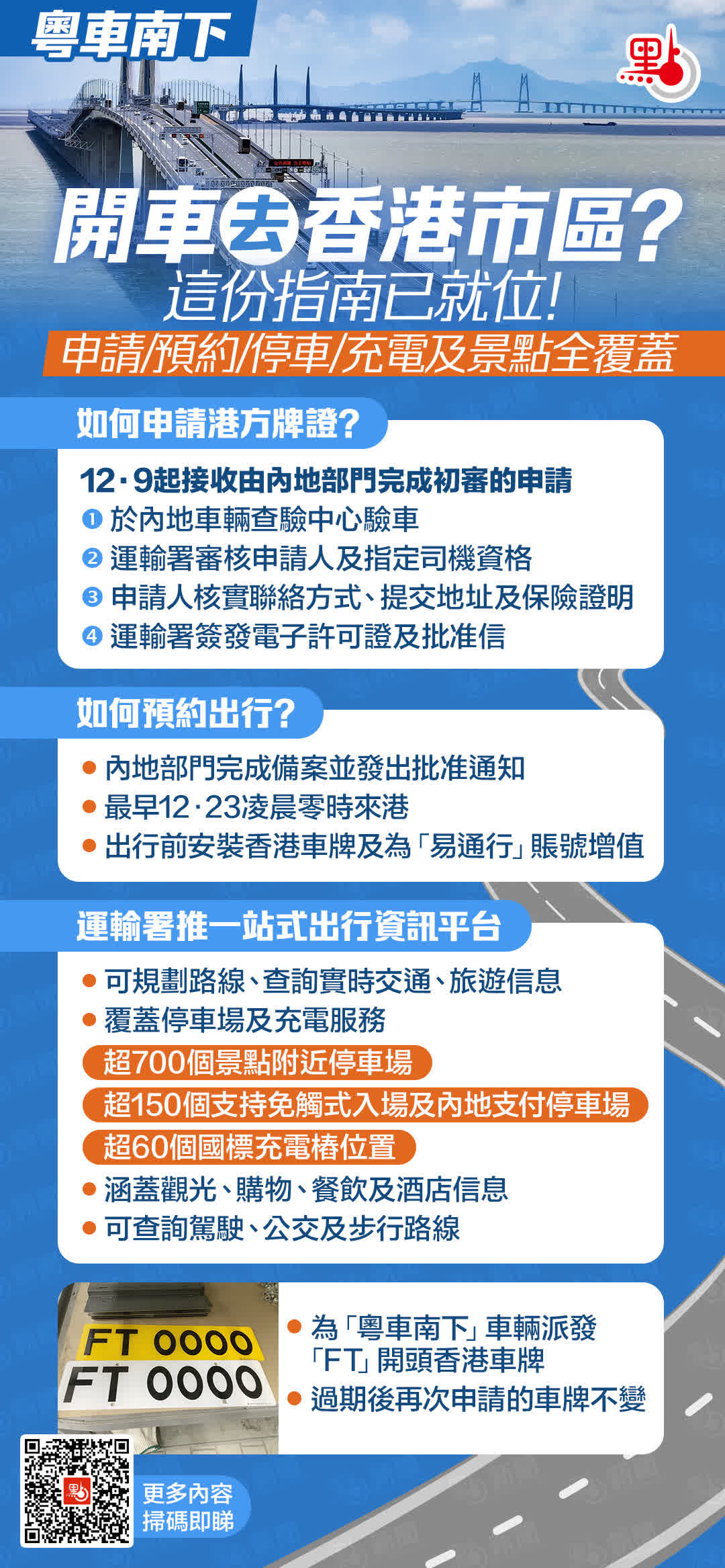 運輸署發言人表示,「粵車南下」(入境市區部分)由12月9日起接受合資格廣東私家車申請。經署方審批後,申請人陸續完成驗車、核實「電子聯絡方式」及購買保險等程序,並在申請平台提交文件。署方將陸續向獲批申請人發出電子許可證和批准信。獲批並成功預約出行的粵車,可由12月23日凌晨零時起經港珠澳大橋入境香港市區,每次留港最多3日。