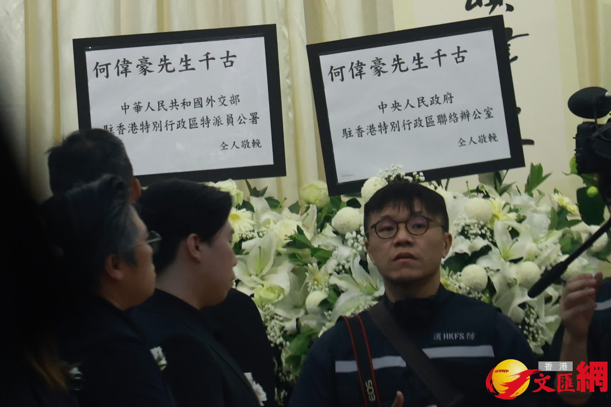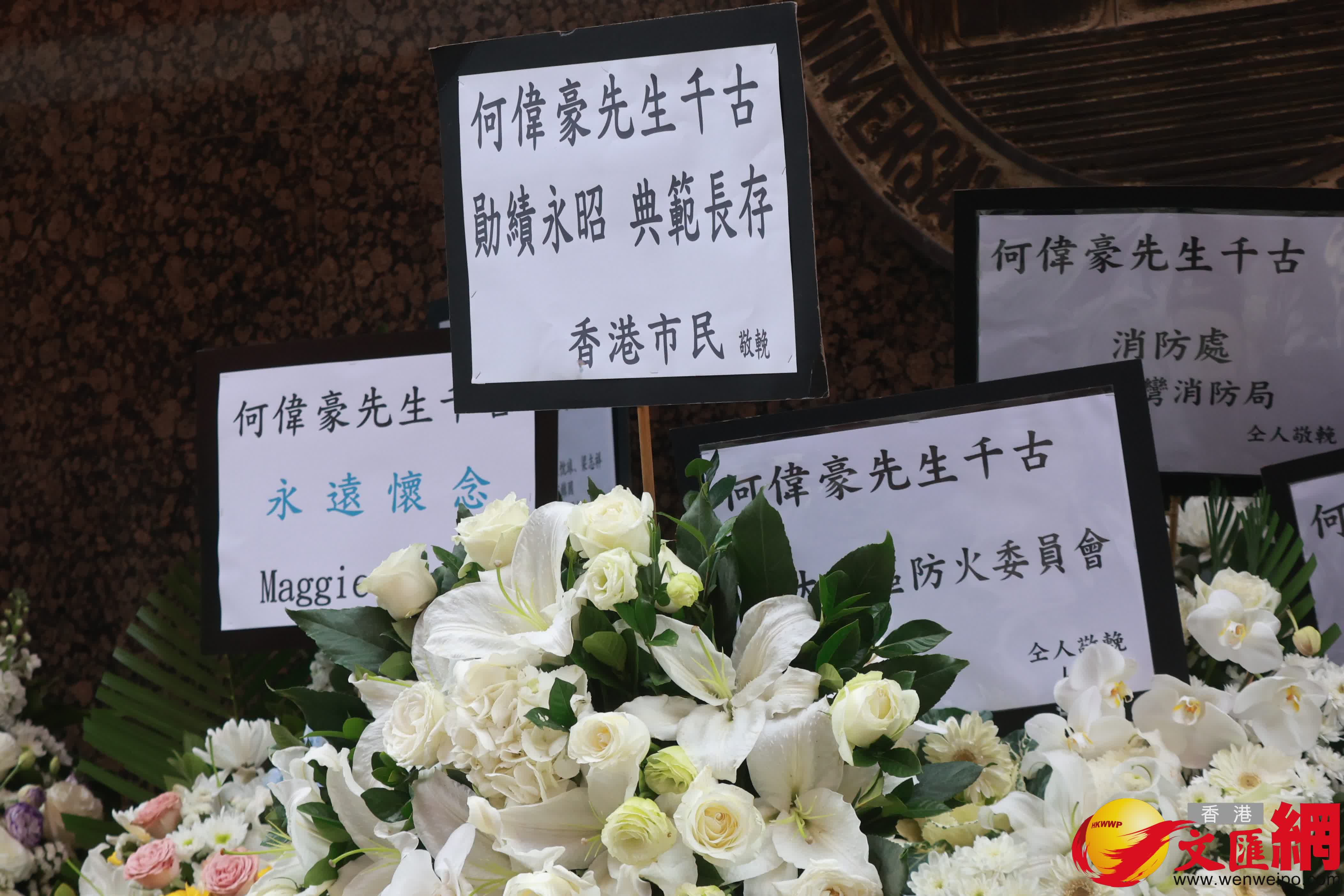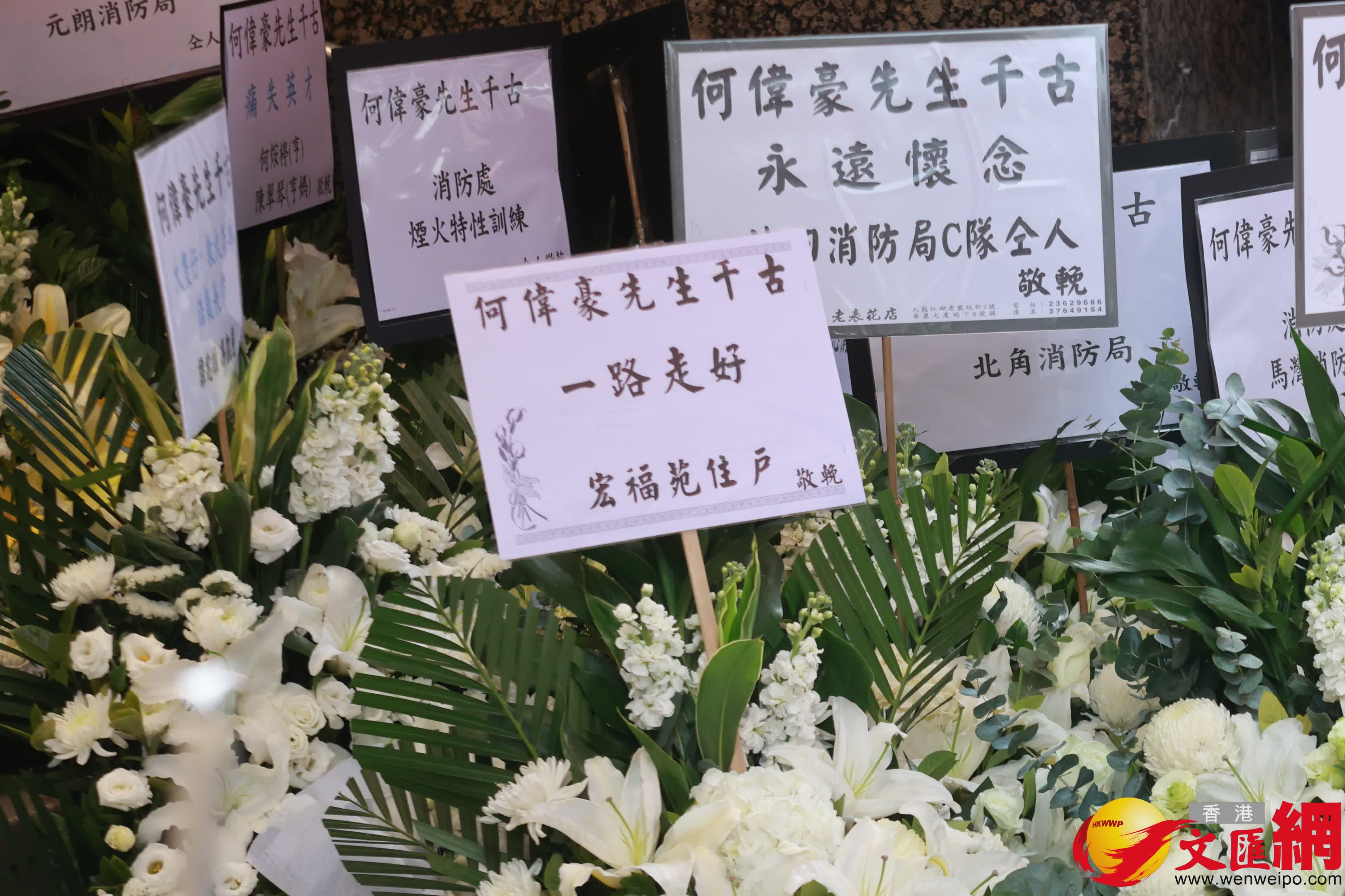 靈堂中央掛上何偉豪穿上消防制服的遺照,橫匾寫上「浩氣長存」四字,堂內外擺放各界致送的花牌,包括政務司司長陳國基、律政司司長林定國等。不少大埔街坊亦送上心意,有宏福苑住戶留言「一路走好」。