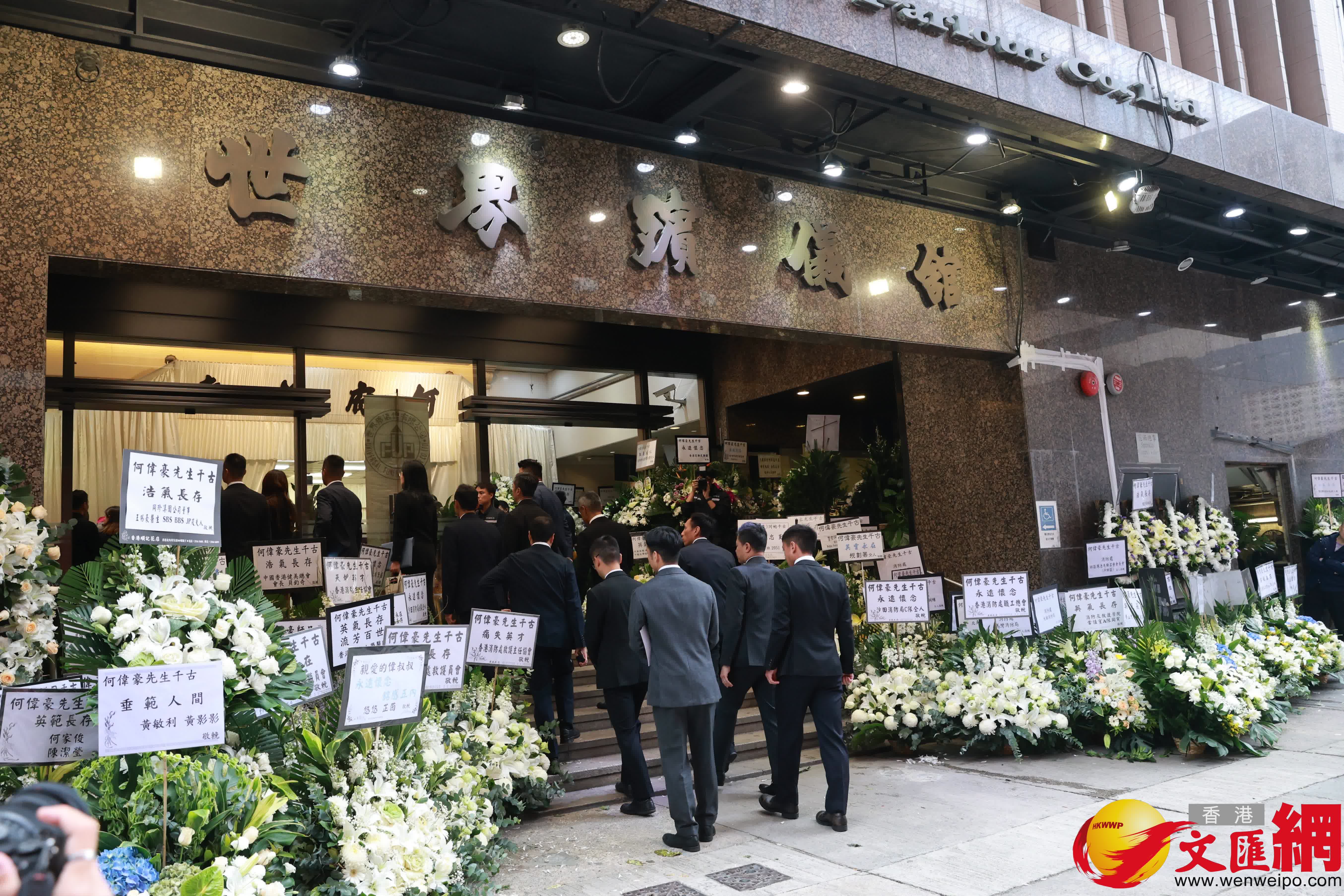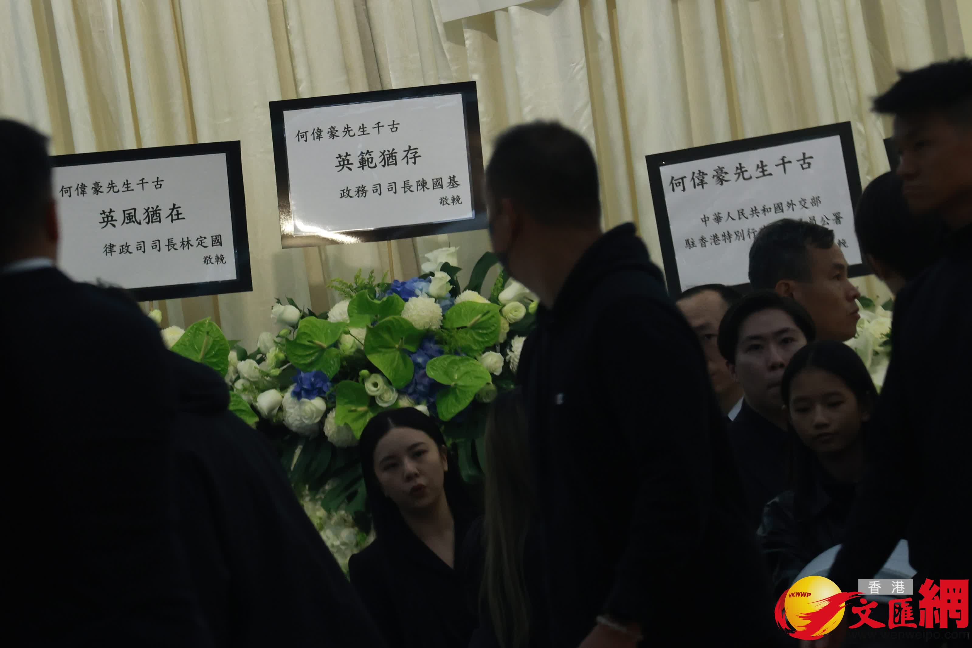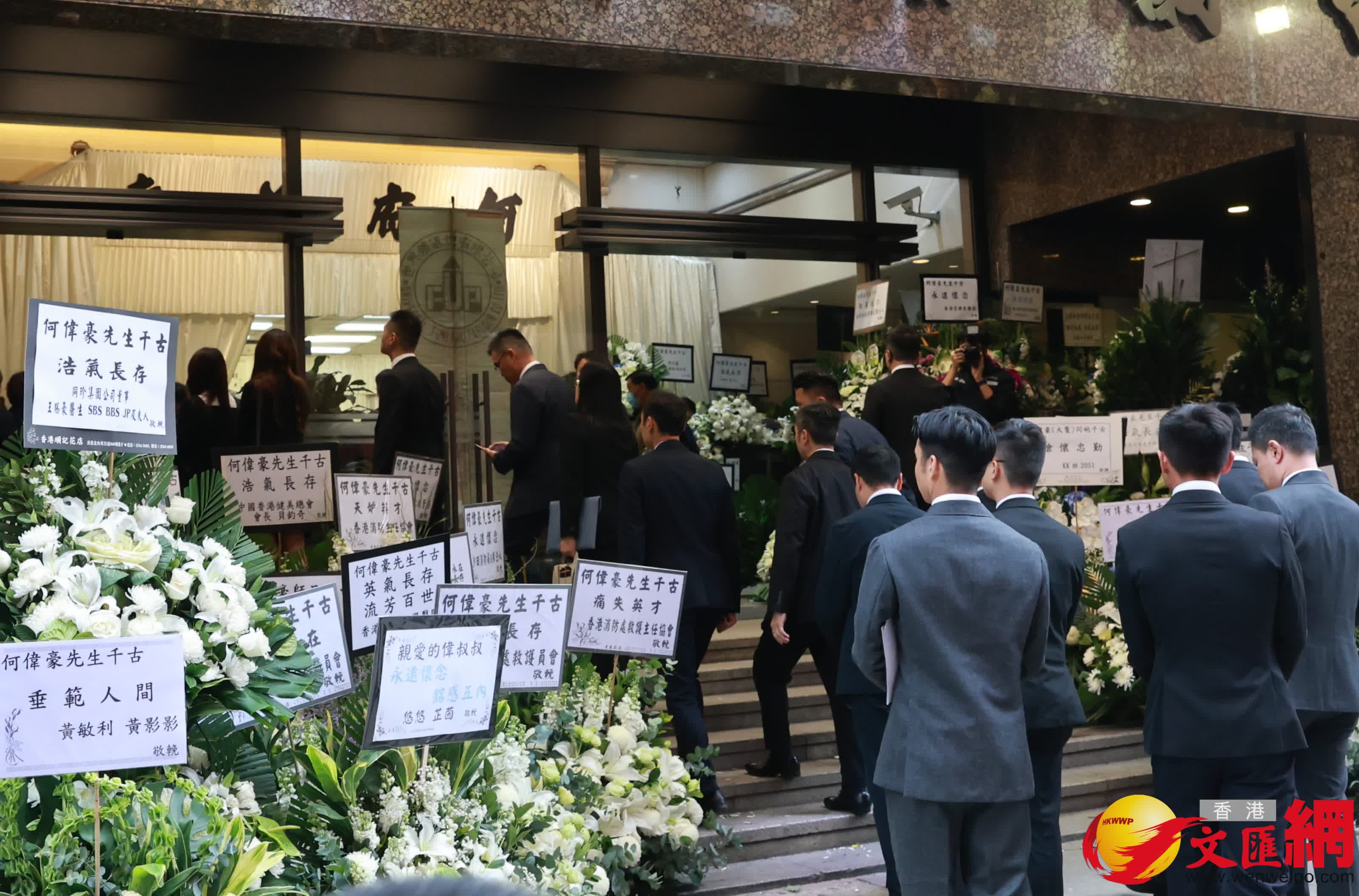 靈堂中央掛上何偉豪穿上消防制服的遺照,橫匾寫上「浩氣長存」四字,堂內外擺放各界致送的花牌,包括政務司司長陳國基、律政司司長林定國等。不少大埔街坊亦送上心意,有宏福苑住戶留言「一路走好」。
