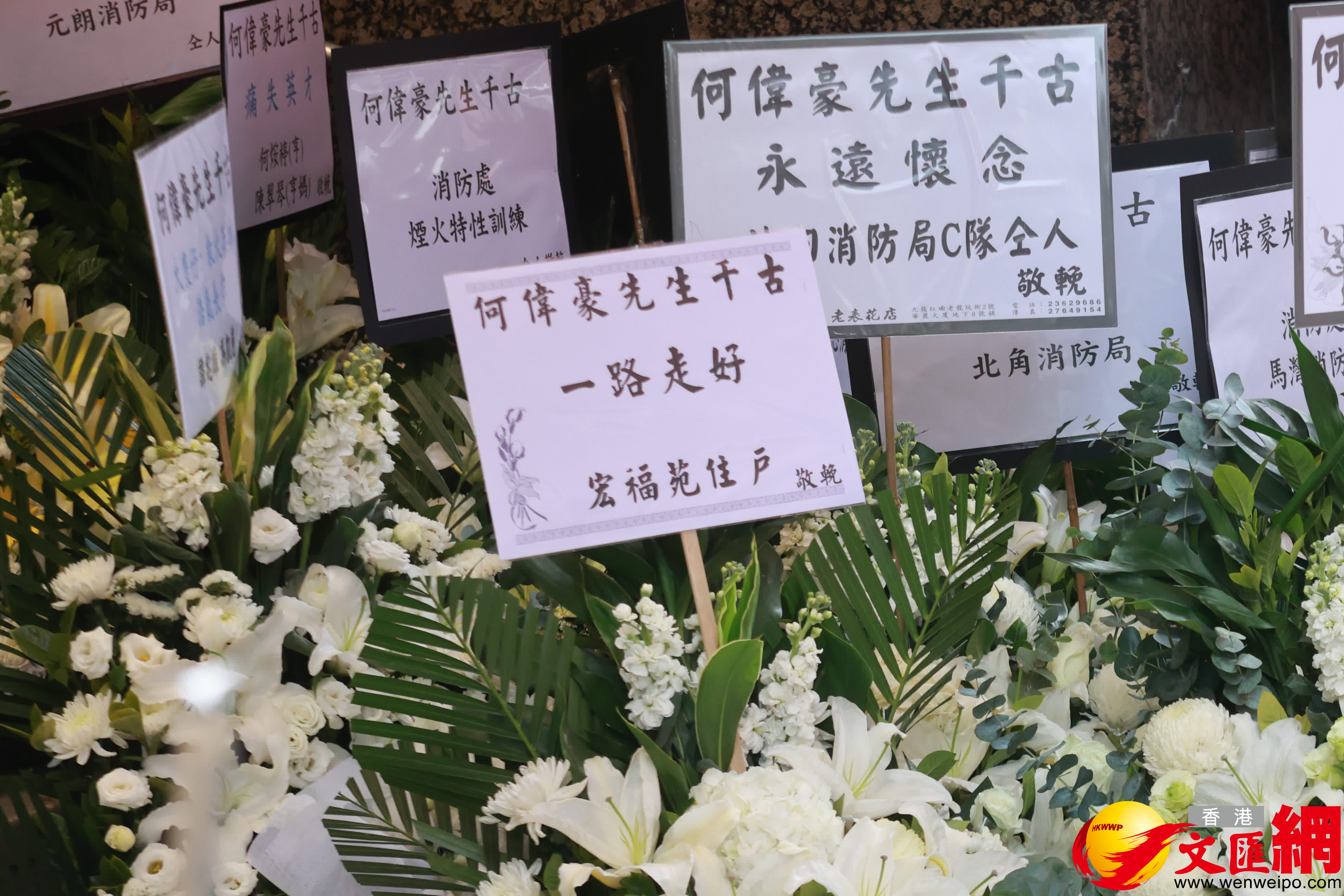 何偉豪穿上消防制服的遺照,與寫上「浩氣長存」的橫匾掛在靈堂中央,遺照前中央位置,則放有何偉豪未婚妻、並寫著:「痛徹心扉」、「不思量,自難忘」的心形花圈,靈堂內則擺放了政府官員及親友致送的花圈。