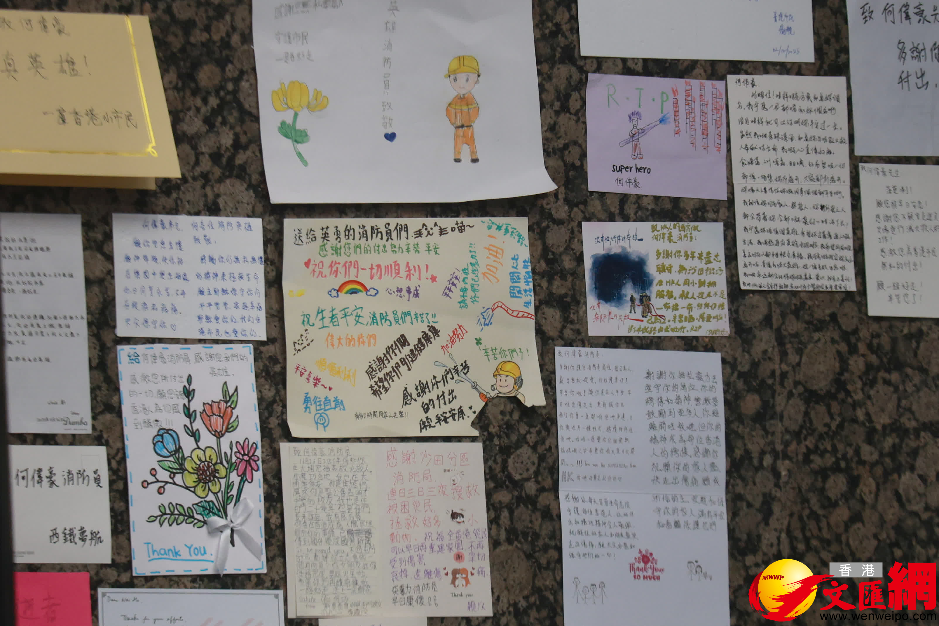 不少市民特意寫上心意卡貼滿靈堂外牆,除了向何偉豪表達敬意,更其向家人表示慰問。其中,有小朋友繪畫了消防員畫像,並寫上「Our Super Hero」(我們的超級英雄),另有市民感謝何偉豪的英勇付出,以生命守護市民,讚揚他是「香港人的驕傲」。入夜後,不少市民抵達殯儀館外排隊輪候,向在火災中捨己為人的英雄致祭。