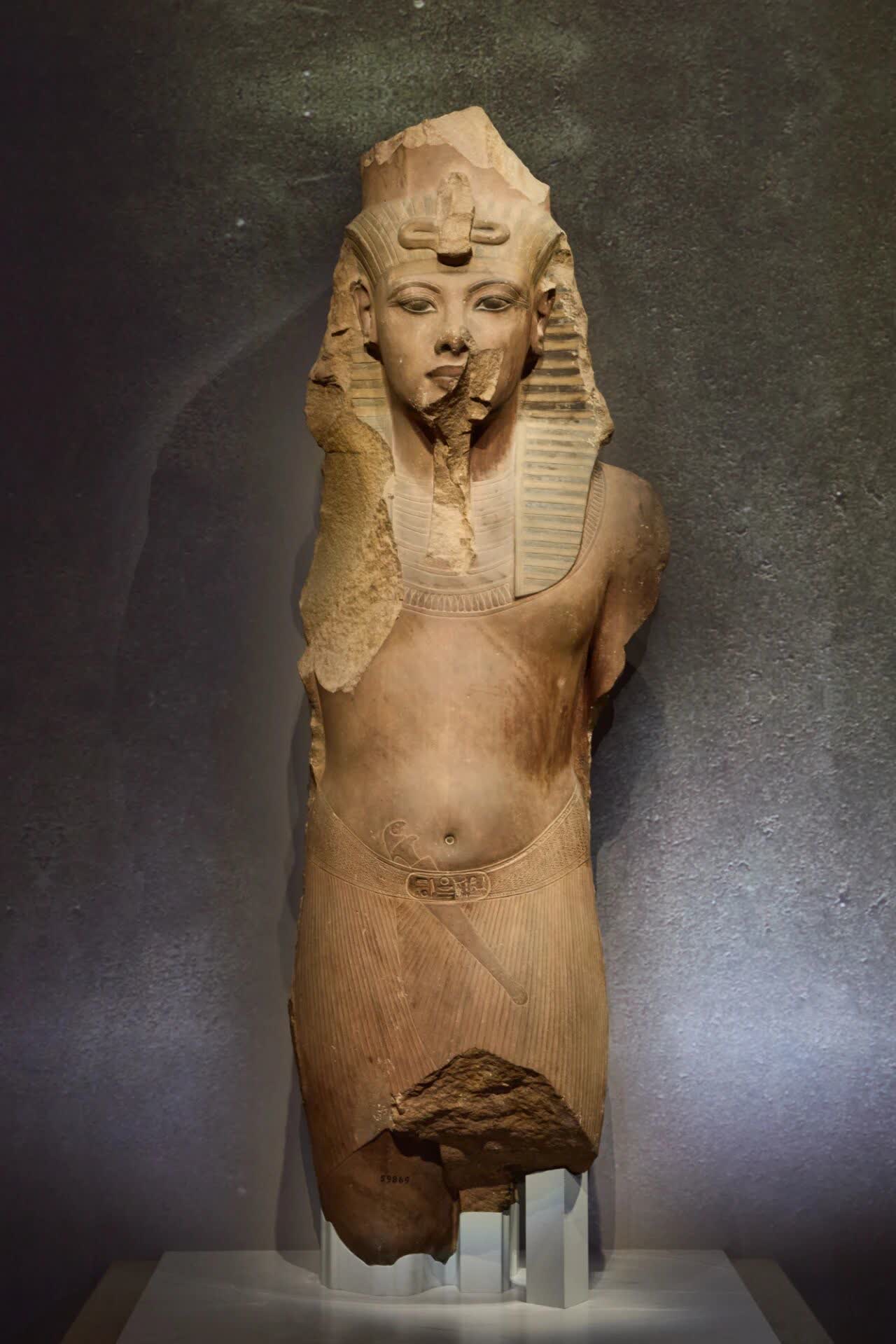 有別於傳統法老雕像絕對對稱的五官及古板嚴肅的面容,圖坦卡門巨像以寫實手法展現出這位少年法老的獨特氣質。與此同時,圖坦卡門的姿態、服飾和莊重的神情均符合傳統準則,塑造出一位帶領埃及回歸傳統宗教、終結動盪的統治者形象。
