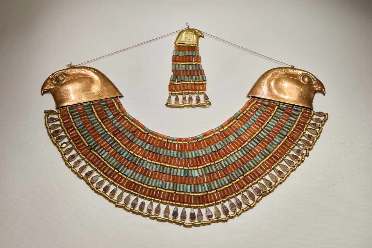 此類造型的項圈在古埃及稱為瓦賽赫,即「寬」之意。這件寬項圈由大小不同的圓柱體彩珠串成,經過精心設計,使用總長度遞減的珠串來創造彎曲的形狀。項圈的兩端以隼頭裝飾物固定。由於項圈大且重,背後以平衡墜配重。在古埃及人眼中,寬項圈不僅是裝飾品,更具有保護力量。該項圈出土自公主努布霍特普塔–克魯迪特的墓葬,被發現時放置於公主木乃伊的脖頸處。