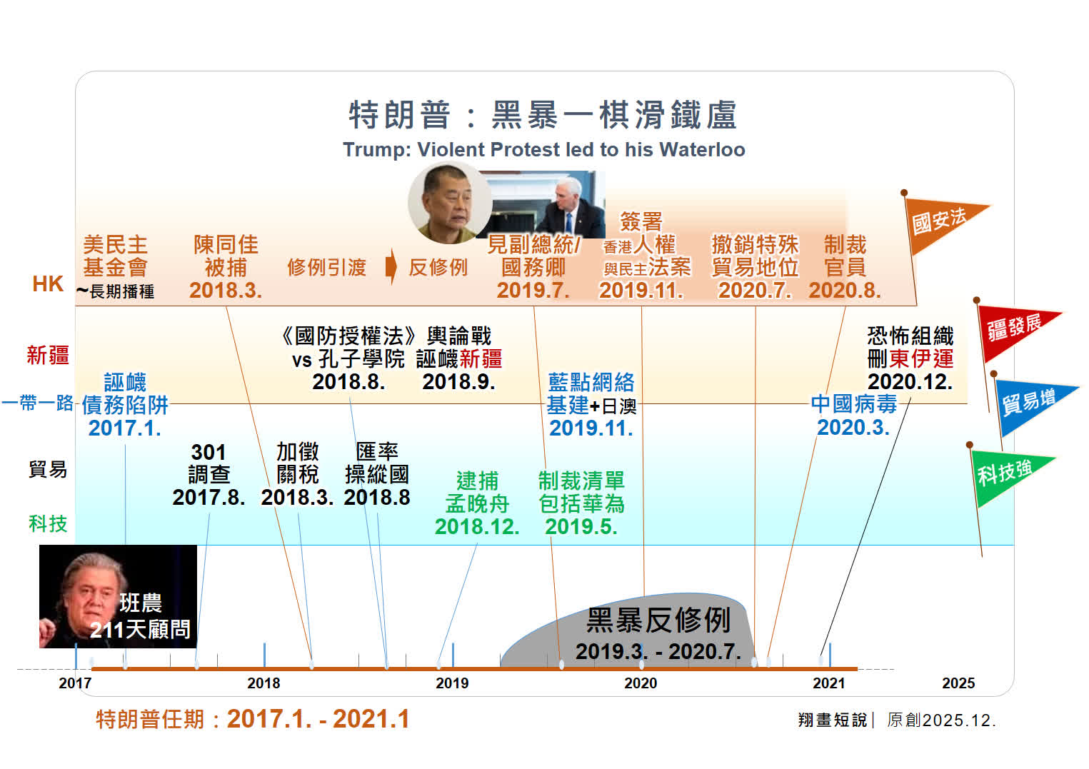 看其背後,不妨重溫特朗普該段期間的對華政策,妄圖從經貿、科技、新疆,以至最後一步,動用香港其棋子來對付中國。結果一一潰敗,淪為特朗普的「滑鐵盧」。