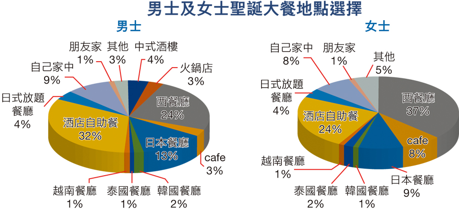 在聖誕大餐的消費方面,今年有52%的男士預計花費501元至1,000元,與去年的 53% 相若;而預算在1,001元至 3,000元的比例則從去年27%下降至今年24%;至於500元以下的選項,則由去年11%上升至今年17%,這反映男士在餐飲上的消費趨向保守。