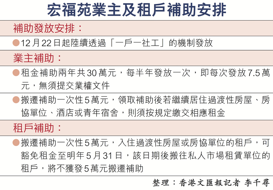 租戶方面,所有在私人市場另租單位的宏福苑租戶,可獲一次性5萬元搬遷補助。政府早前已透過「華潤慈善基金」及援助基金,向受影響租戶分別提供1萬元及10萬元支援,今次再增發5萬元搬遷補助,相信能照顧到租戶未來需求,順利覓得新租住單位。