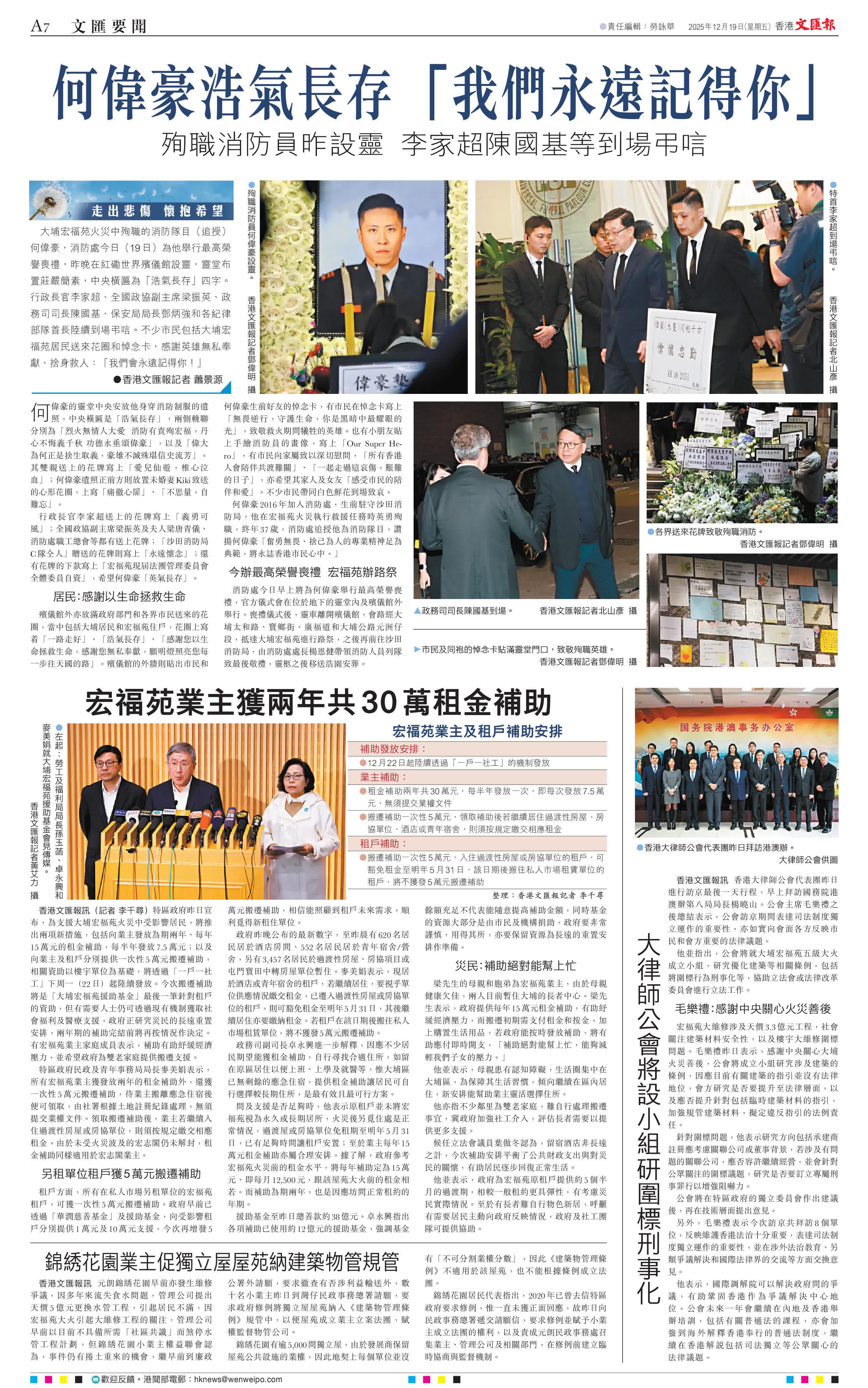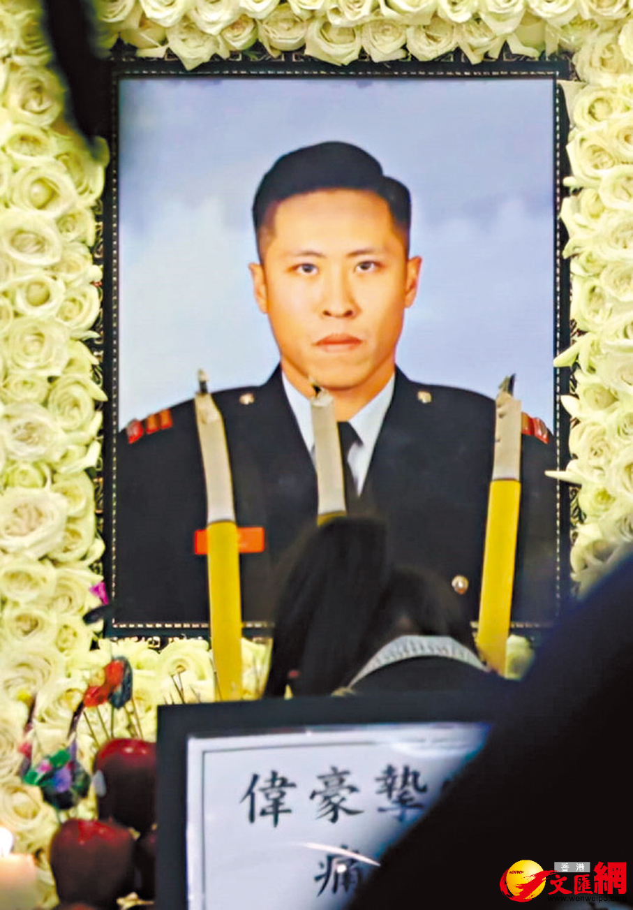 (香港文匯報記者 蕭景源)大埔宏福苑火災中殉職的消防隊目(追授)何偉豪,消防處今日(19日)為他舉行最高榮譽喪禮,昨晚在紅磡世界殯儀館設靈,靈堂布置莊嚴簡素,中央橫匾為「浩氣長存」四字。行政長官李家超、全國政協副主席梁振英、政務司司長陳國基、保安局局長鄧炳強和各紀律部隊首長陸續到場弔唁。不少市民包括大埔宏福苑居民送來花圈和悼念卡,感謝英雄無私奉獻、捨身救人:「我們會永遠記得你!」