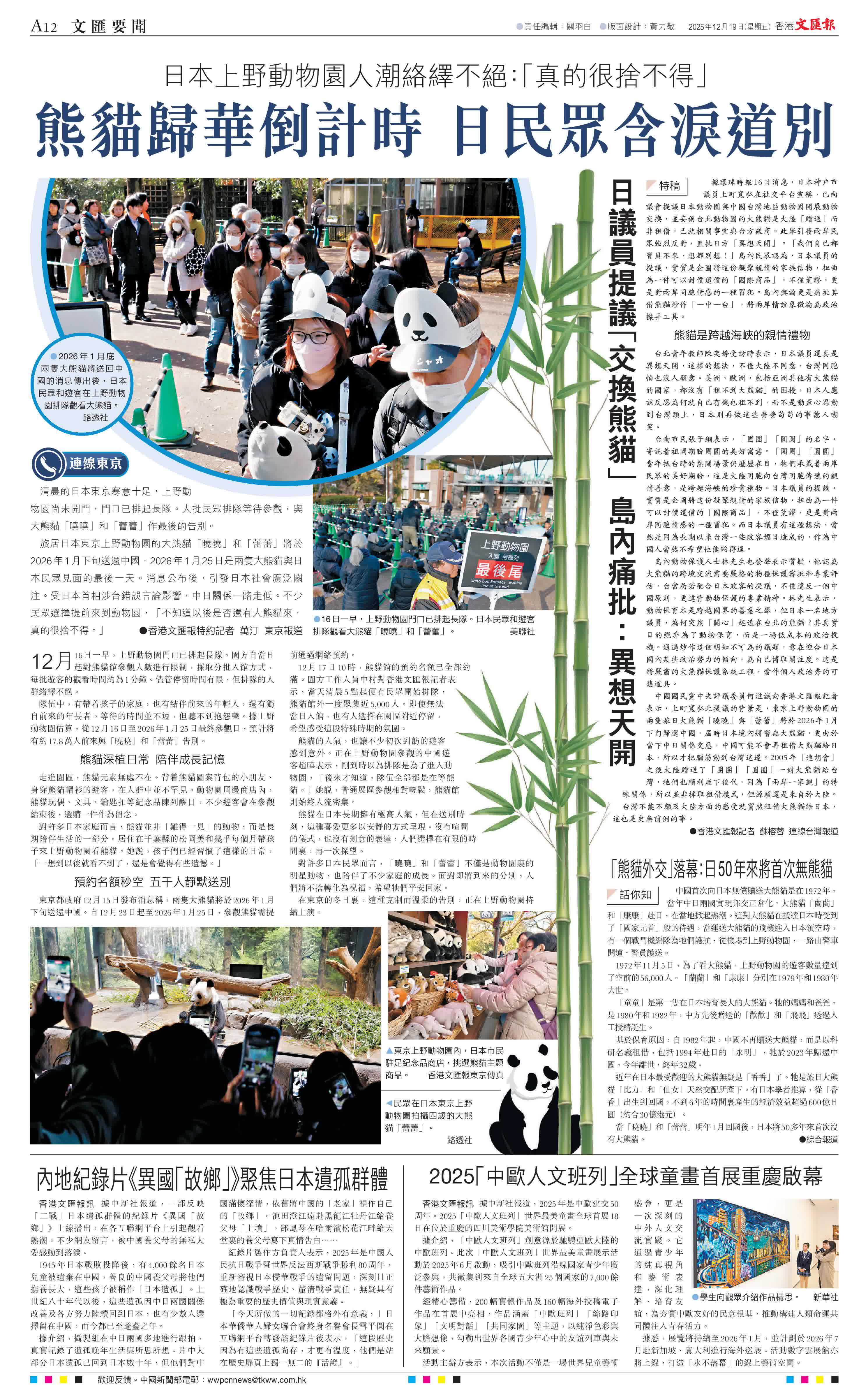 旅居日本東京上野動物園的大熊貓「曉曉」和「蕾蕾」將於2026年1月下旬送還中國,2026年1月25日是兩隻大熊貓與日本民眾見面的最後一天。消息公布後,引發日本社會廣泛關注。受日本首相涉台錯誤言論影響,中日關係一路走低。不少民眾選擇提前來到動物園,「不知道以後是否還有大熊貓來,真的很捨不得。」