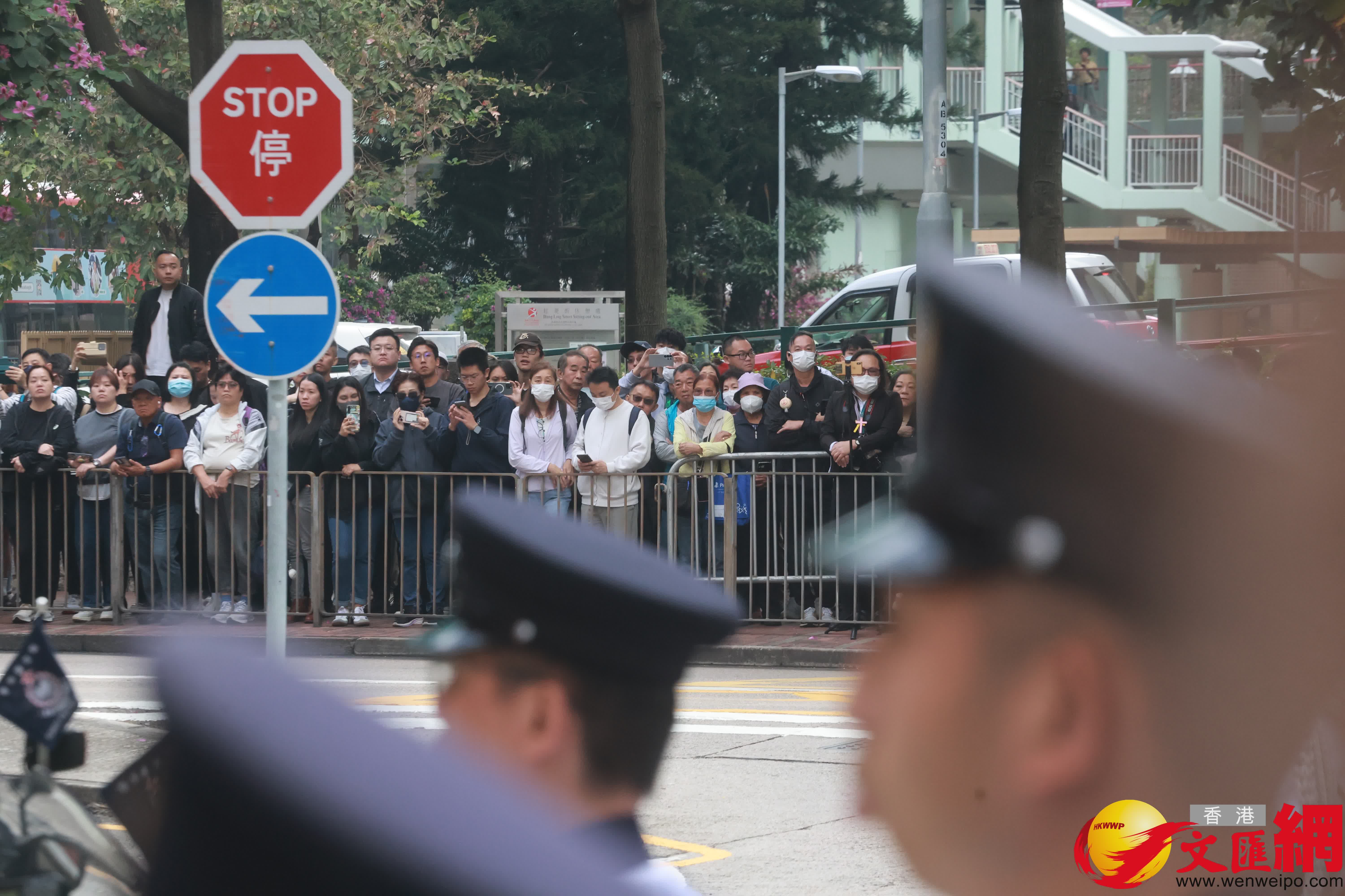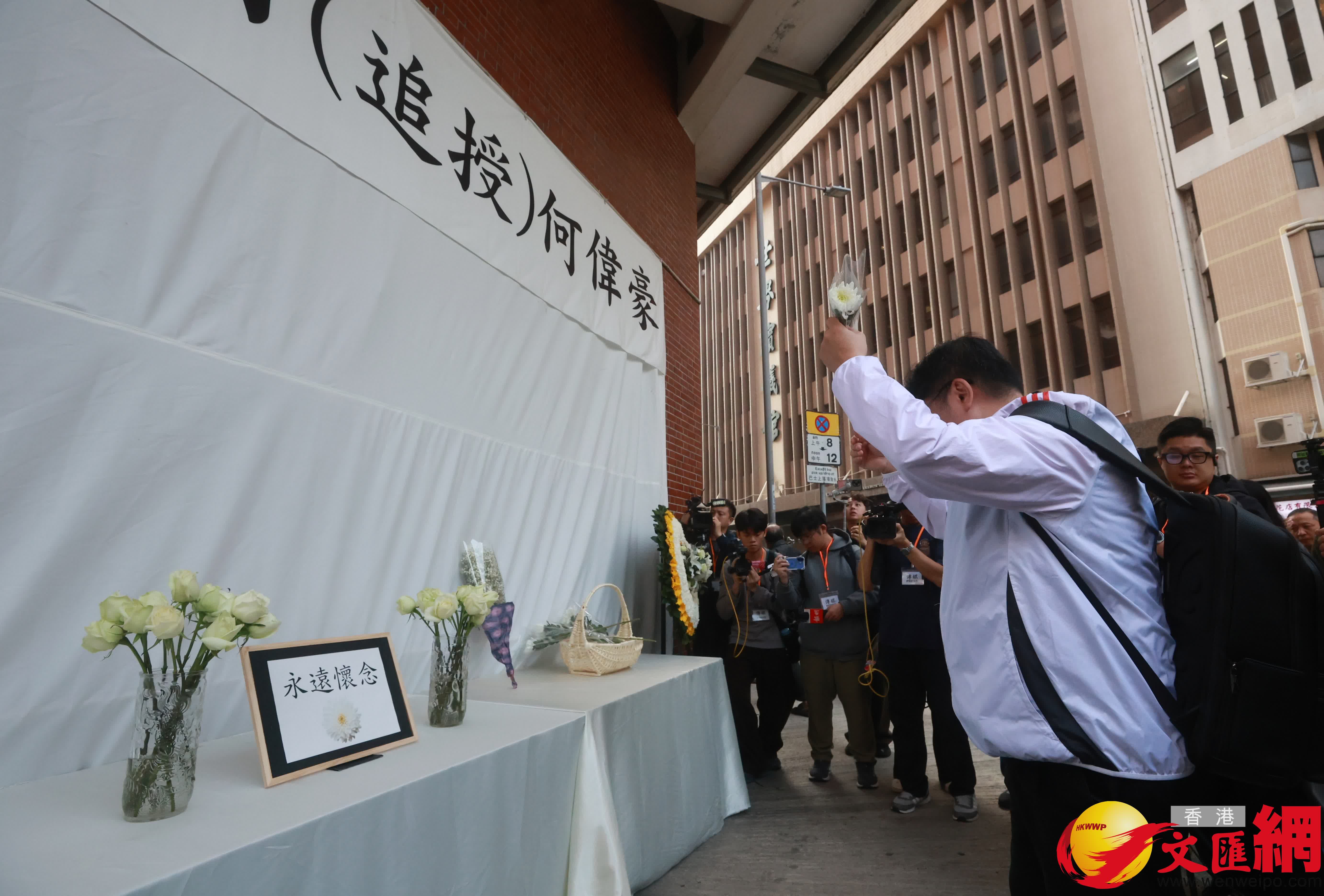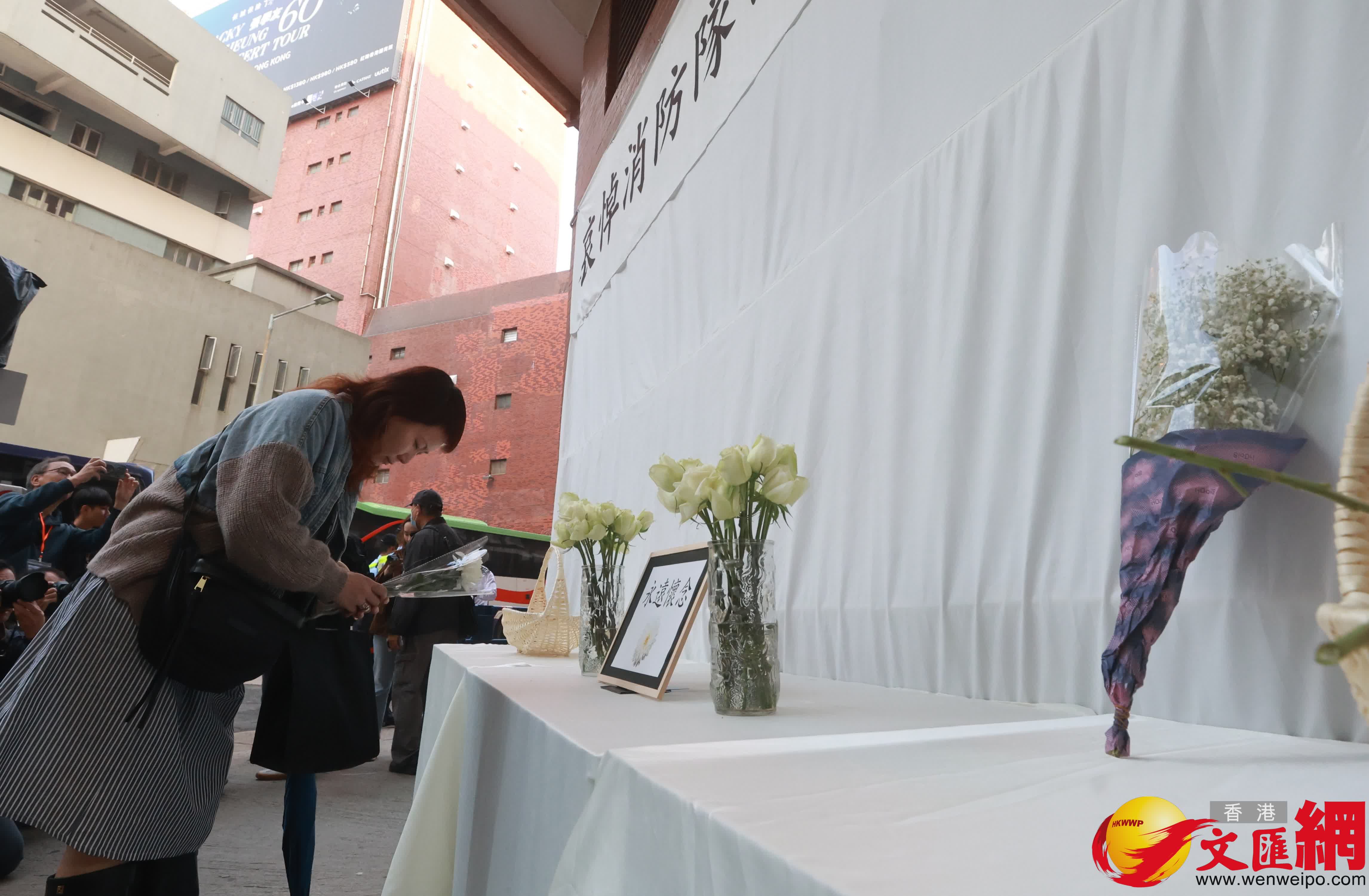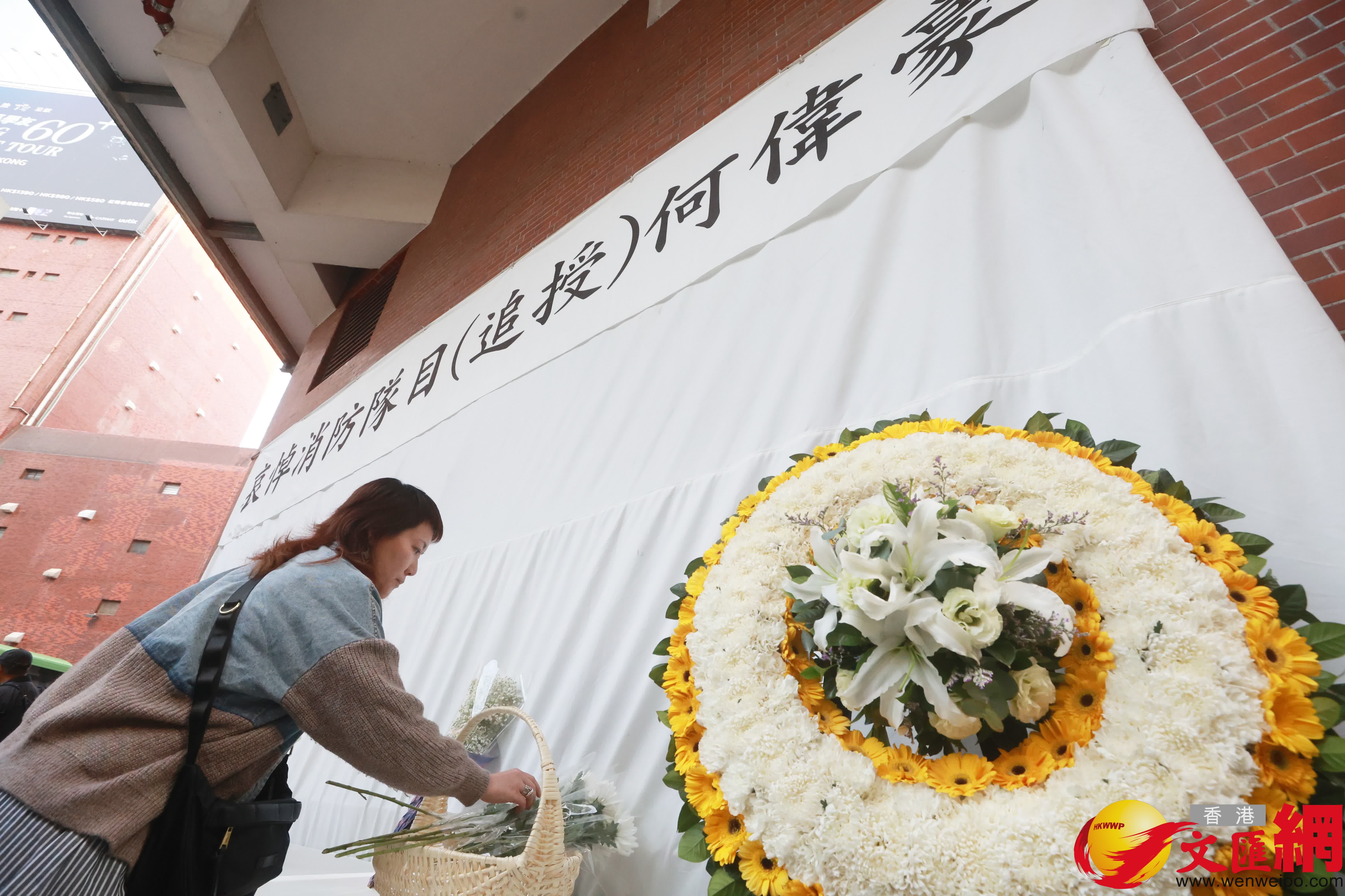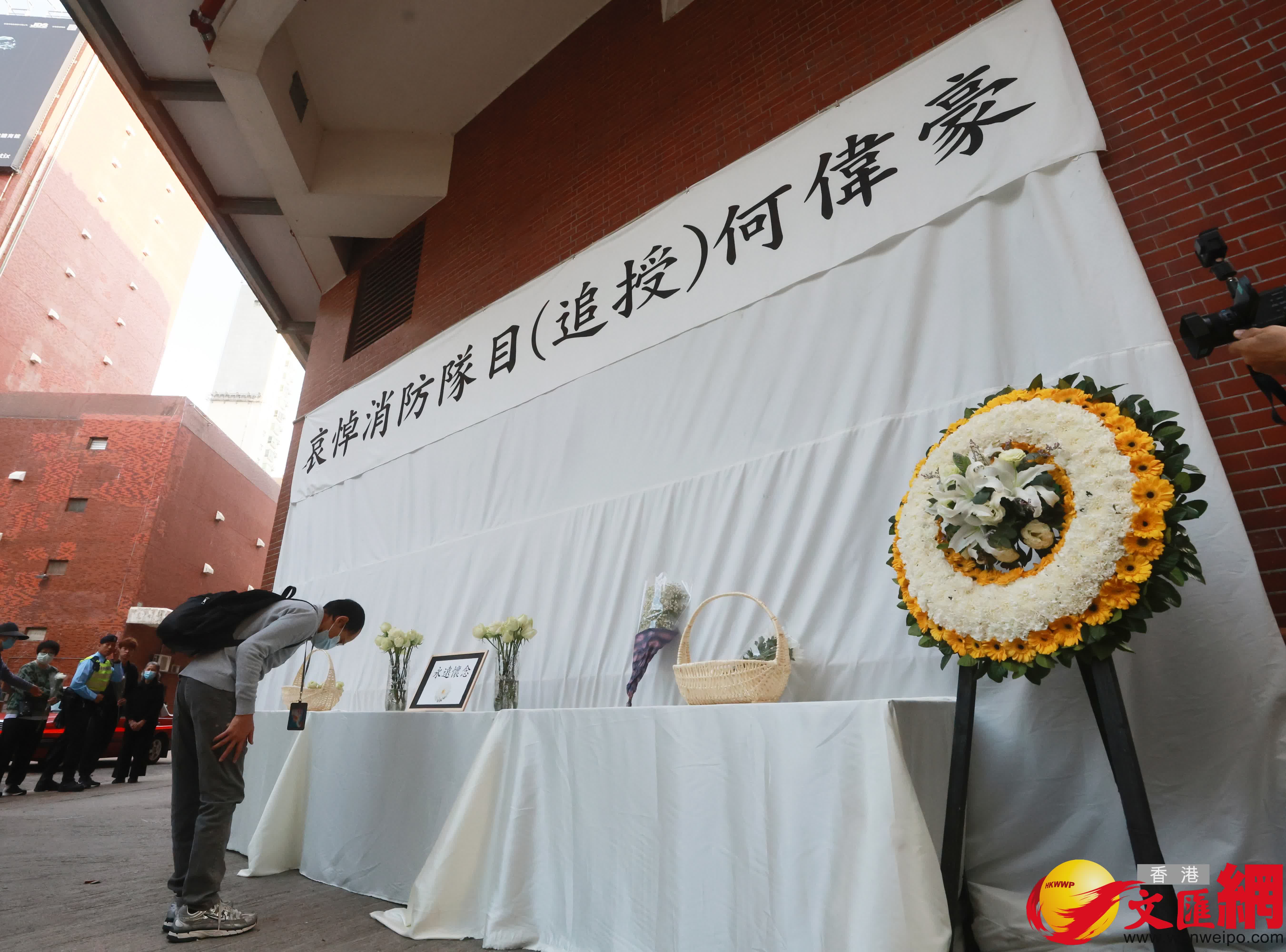在大埔宏福苑火災中殉職的消防隊目(追授)何偉豪,早上在紅磡世界殯儀館舉殯,陸續有市民到殯儀館外向何偉豪獻花致哀。(香港文匯報 郭木又 攝)