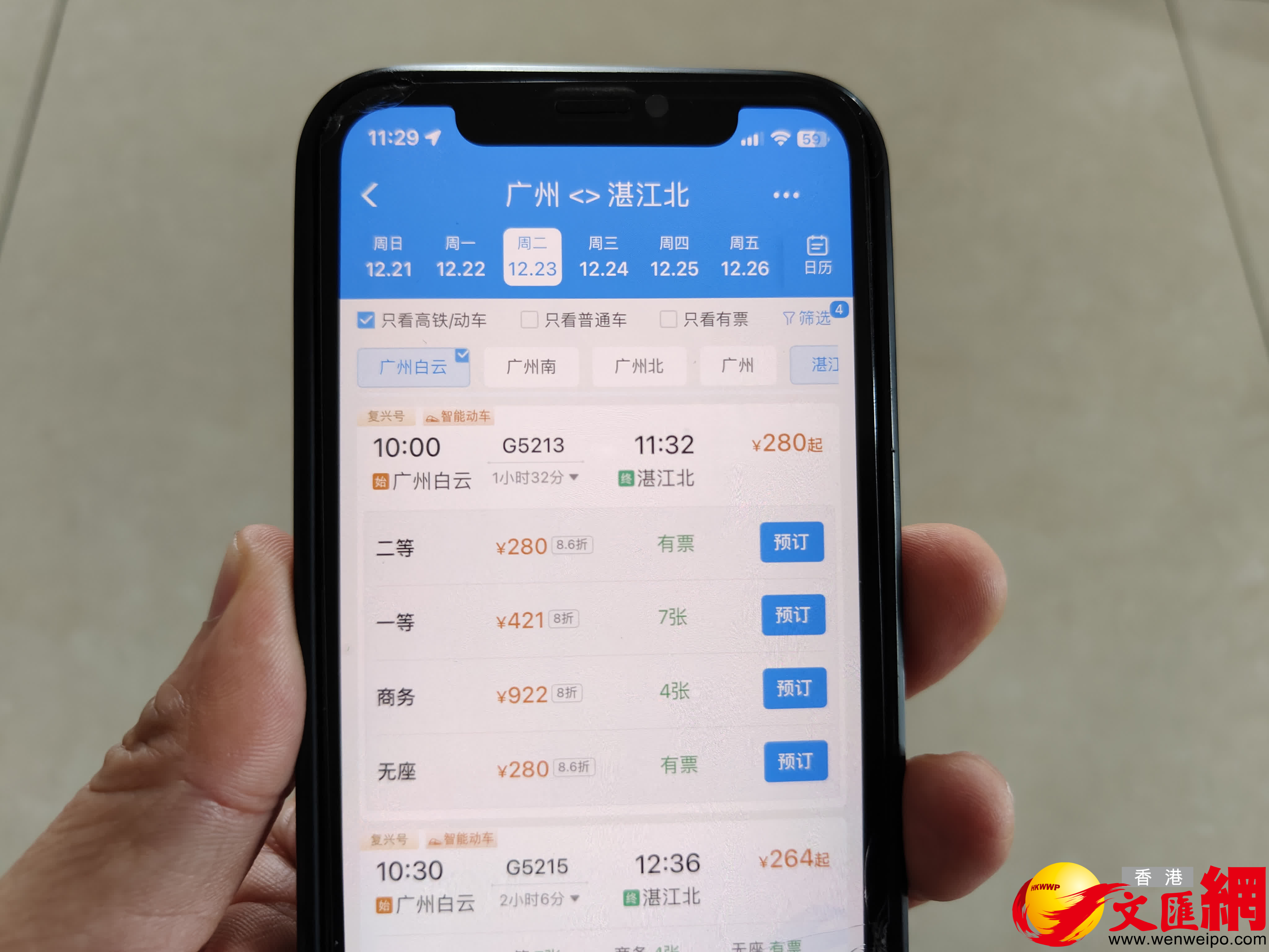 (香港文匯網記者 方俊明)廣州至湛江高鐵(下稱「廣湛高鐵」)將於12月22日建成通車。國鐵廣州局客運部相關負責人表示,廣湛高鐵實施靈活折扣、差異化的市場化票價機制,為旅客出行提供更多選擇。記者今天(19日)從中國鐵路12306網站了解到,廣州白雲站至湛江北站的高鐵二等座票價分別為247元、264元、280元(人民幣,下同)。其中,從廣州白雲站直達湛江北站、途中不停站的高鐵列車,二等座票價為280元,最快僅需1小時32分鐘,較目前廣州南站至湛江西站動車組約2.5小時至3小時以上的車程,節省時間約40%乃至一半左右。