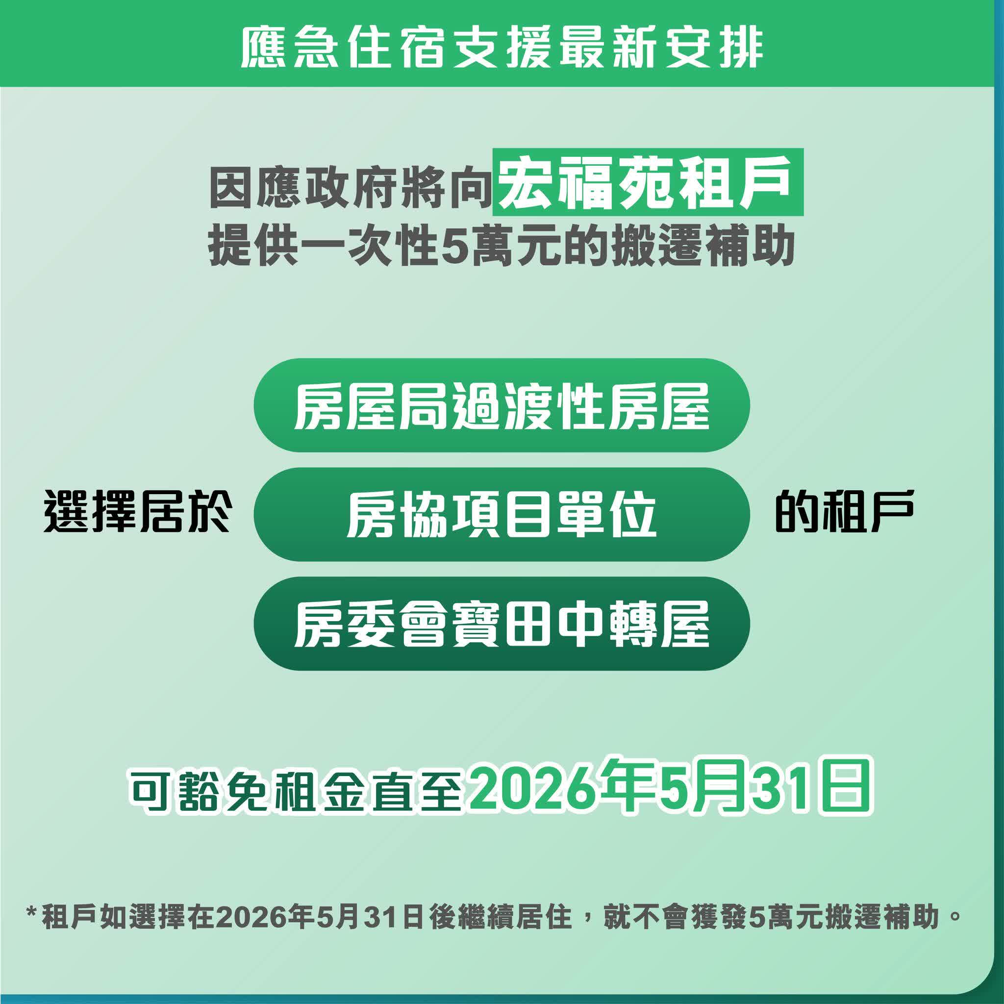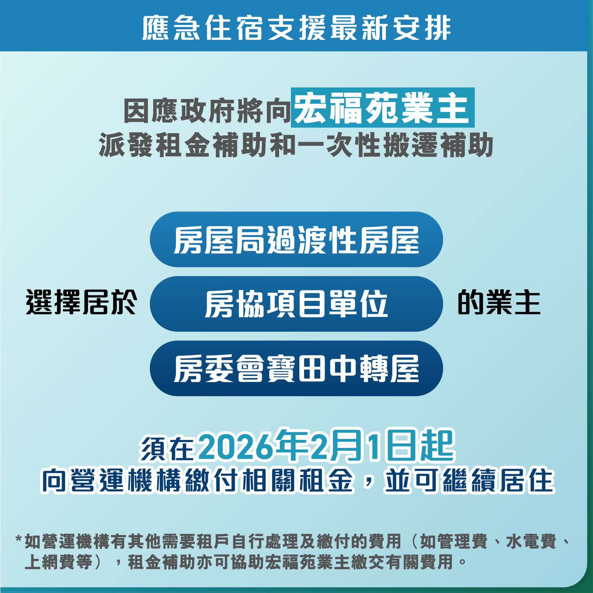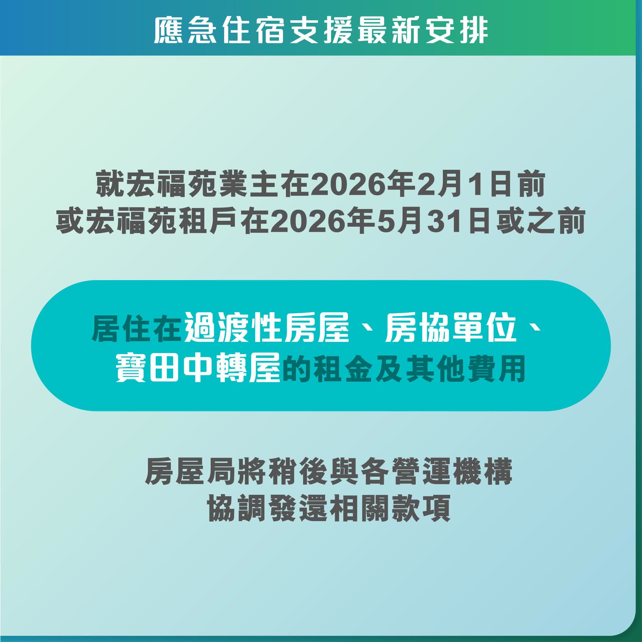 其中,若選擇住在過渡性房屋、房協單位及寶田中轉屋的宏福苑業主,須在2026年2月1日起向營運機構繳付相關租金,便可繼續居住;宏福苑租戶則可豁免租金直至2026年5月31日。至於宏福苑業主在2026年2月1日前,或宏福苑租戶在2026年5月31日或之前居住在過渡性房屋、房協單位、寶田中轉屋的租金及其他費用,房屋局將稍後與各營運機構協調發還相關款項予各機構。
