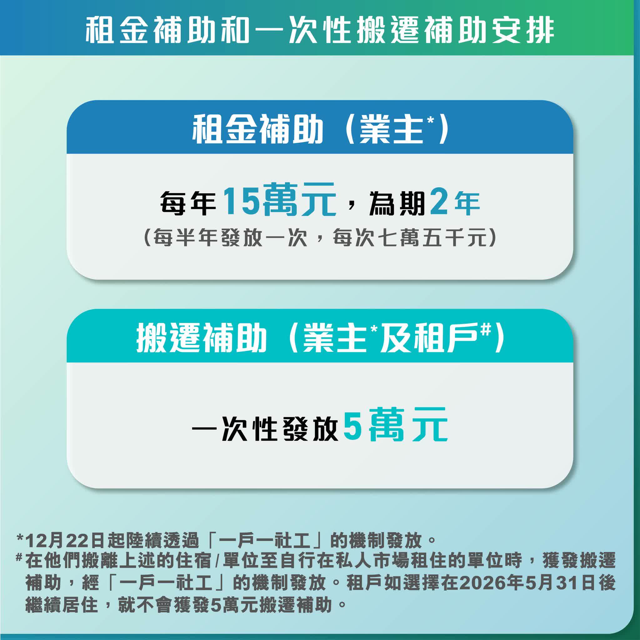 因應特區政府昨日宣布,「大埔宏福苑援助基金」將向受影響的業主發放每年15萬元的租金補助和一次性5萬元的搬遷補助,及向受影響的租戶發放一次性5萬元的搬遷補助,有關應急住宿亦相應調整作出最新安排。