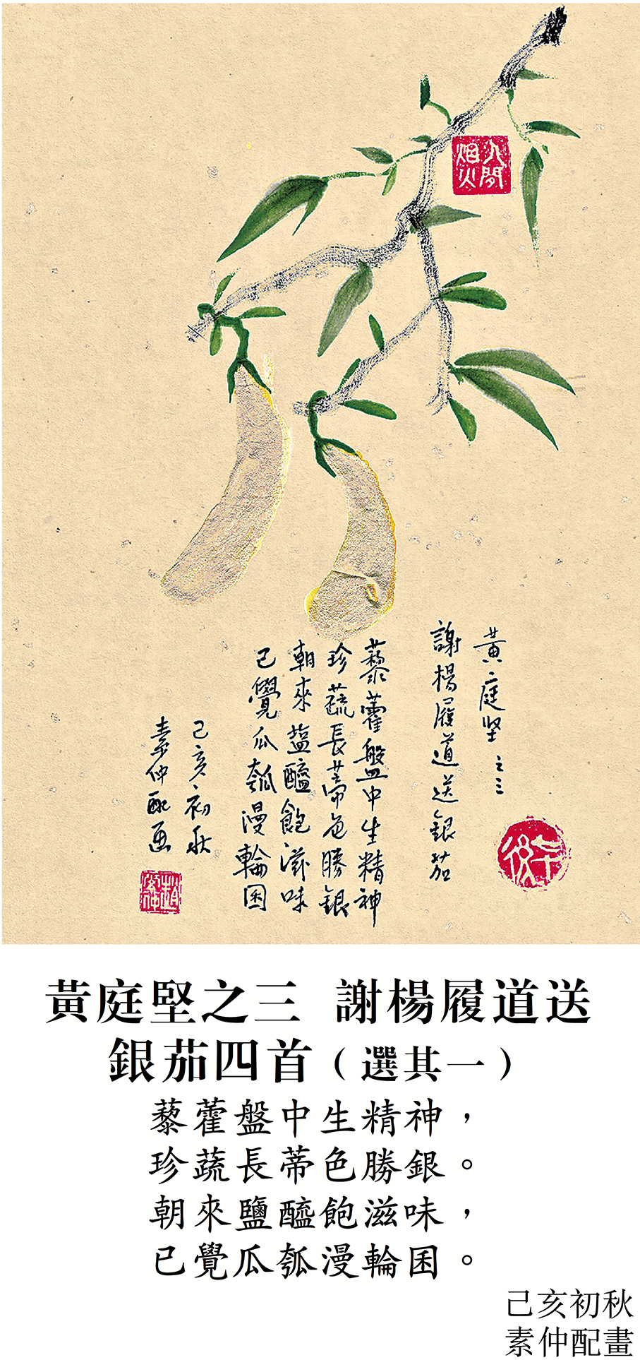 黃庭堅收到好朋友楊履道送贈的銀茄子,欣然賦詩四首致謝。這一首是描寫晨餐食銀茄子的感受。只看着茄子在盤中已覺精神一爽,茄子的銀白色令人倍覺珍貴。第二首:「君家水茄白銀色,殊勝壩裏紫彭亨(紫茄的別稱)。蜀人生疏不下箸,吾與北人俱眼明。」原來蜀人不懂吃白色的茄子。第四首:「畦丁收盡垂露實,葉底猶藏十二三。待得銀包已成殼,更當乞種過江南。」表達了黃庭堅希望討得良茄種子回江南種植。