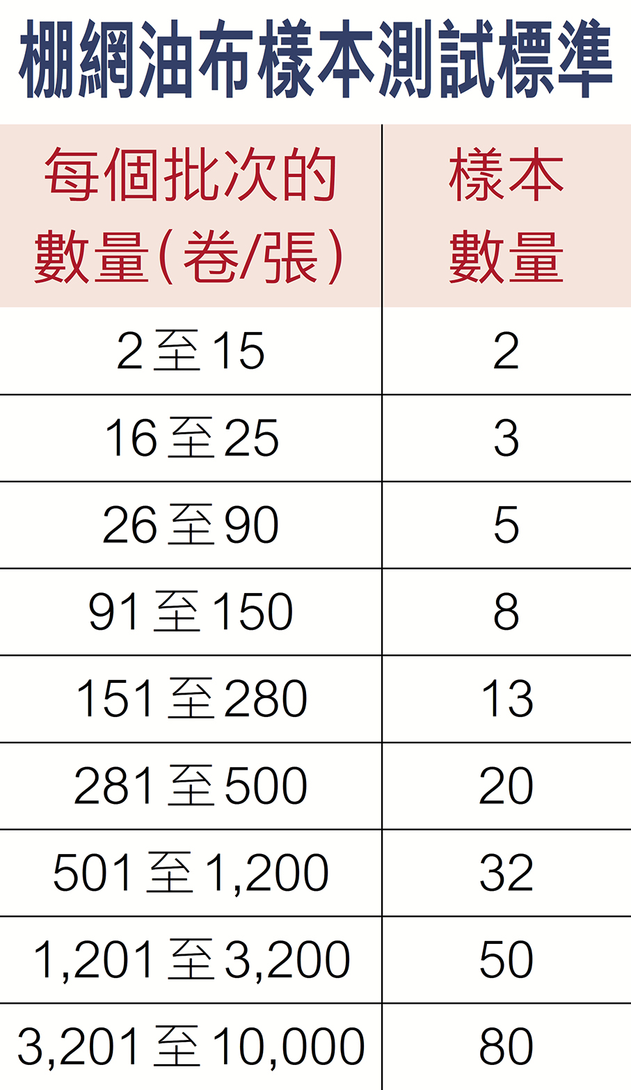 香港文匯報訊(記者 張茗)大埔宏福苑五級大火,令棚架防護網的阻燃效能備受關注。香港特區政府屋宇署昨日(19日)公布最新《註冊承建商作業備考》,強制要求承建商對棚架保護網、防水油布等防護物料進行嚴格阻燃測試,測試須由政府指定認可實驗所進行,批次內任何一個樣本不合格,整個批次不能使用。只有所有樣本都合格,該批次方可上架。新要求亦包括抽驗的樣本尺寸不應小於1.8米乘2米,每卷或每張防護物料不應抽取多於一個樣本,並須按每張訂單購買的批次數量,抽取不少於按ISO 2859 - 1標準制定的數量的樣本。其中,每個批次2至15卷或張,至少要抽兩個樣本;每個批次達3,201張,則至少要抽取80個樣本(見表)。