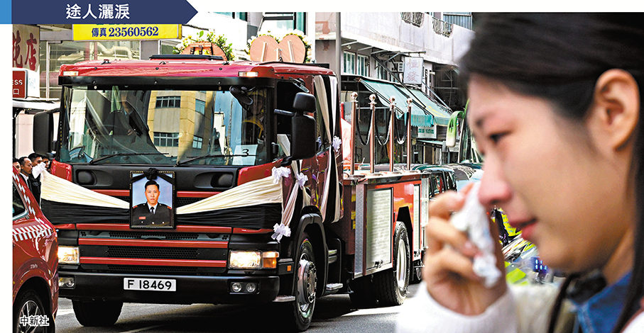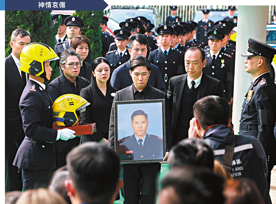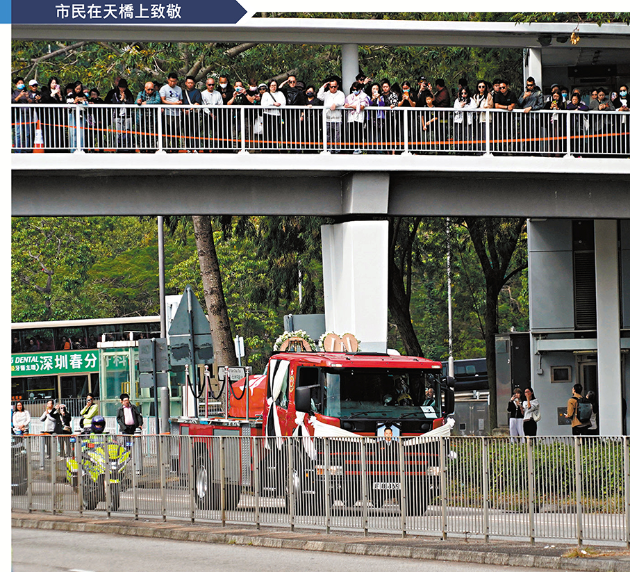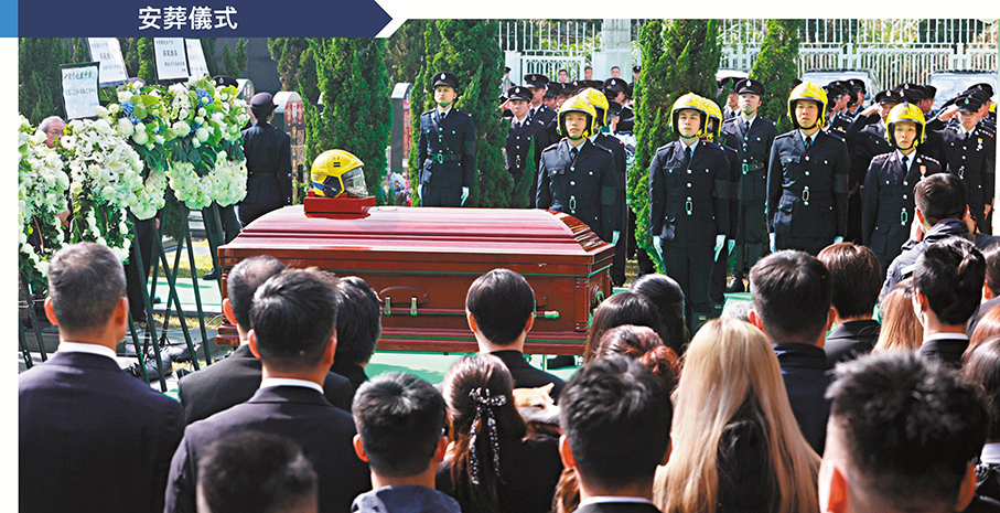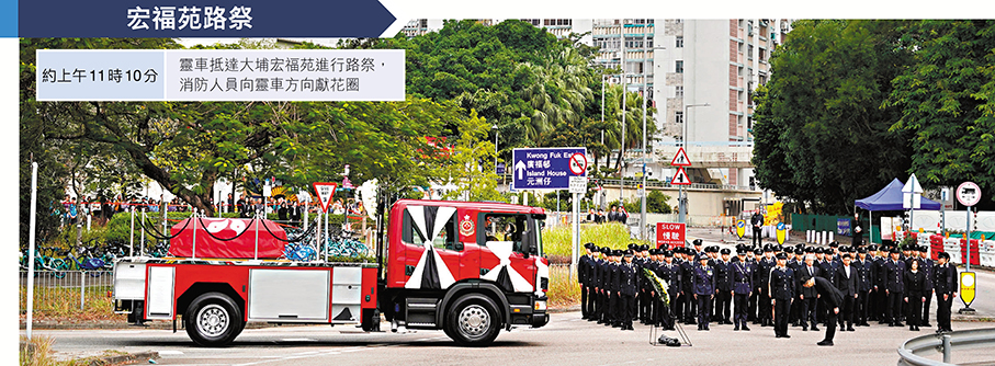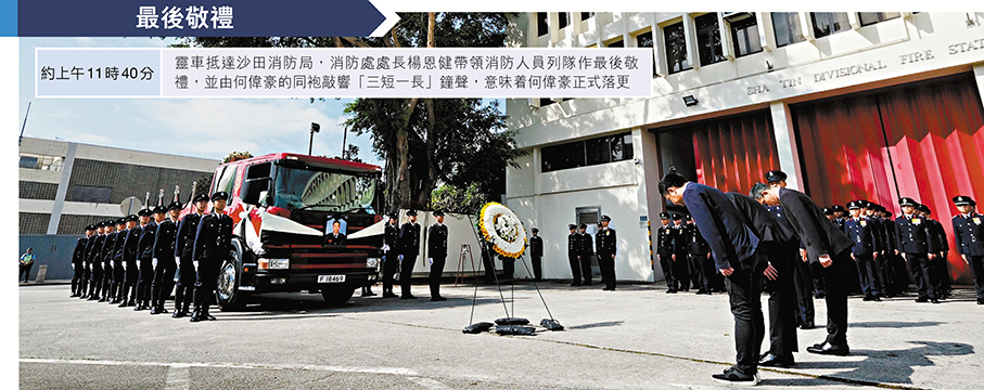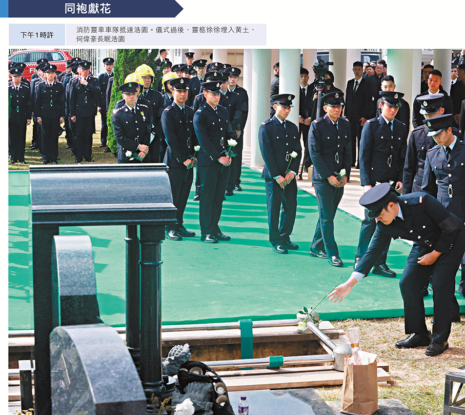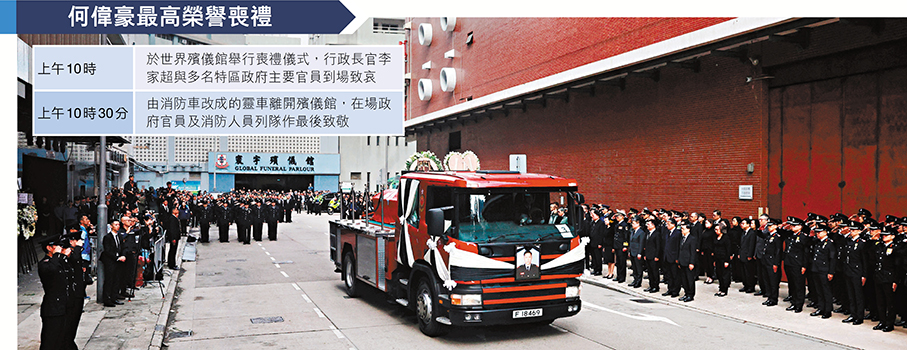 大埔宏福苑五級火災造成逾百死傷,37歲的消防隊目(追授)何偉豪亦在大火中英勇殉職,消防處昨日於紅磡世界殯儀館為其舉行最高榮譽喪禮。喪禮儀式後,由消防車改成的靈車由紅磡出發,先後前往大埔宏福苑及沙田消防局,接受市民與同袍向這位英雄作最後致敬及送別,過程中氣氛莊嚴哀戚,有市民攜同子女前來致敬,讚揚消防員是守護城市的英雄,祝願何隊目一路好走。靈車隨後駛往浩園,逾千人出席儀式,眾多消防同袍難掩悲痛,數度落淚。多名送行的沙田消防局同袍形容何偉豪是分局的「光榮與驕傲」,讚他為人熱心、積極上進、深受敬重。在哀樂聲中,靈柩徐徐埋入黃土,何偉豪長眠浩園,其英名長存。