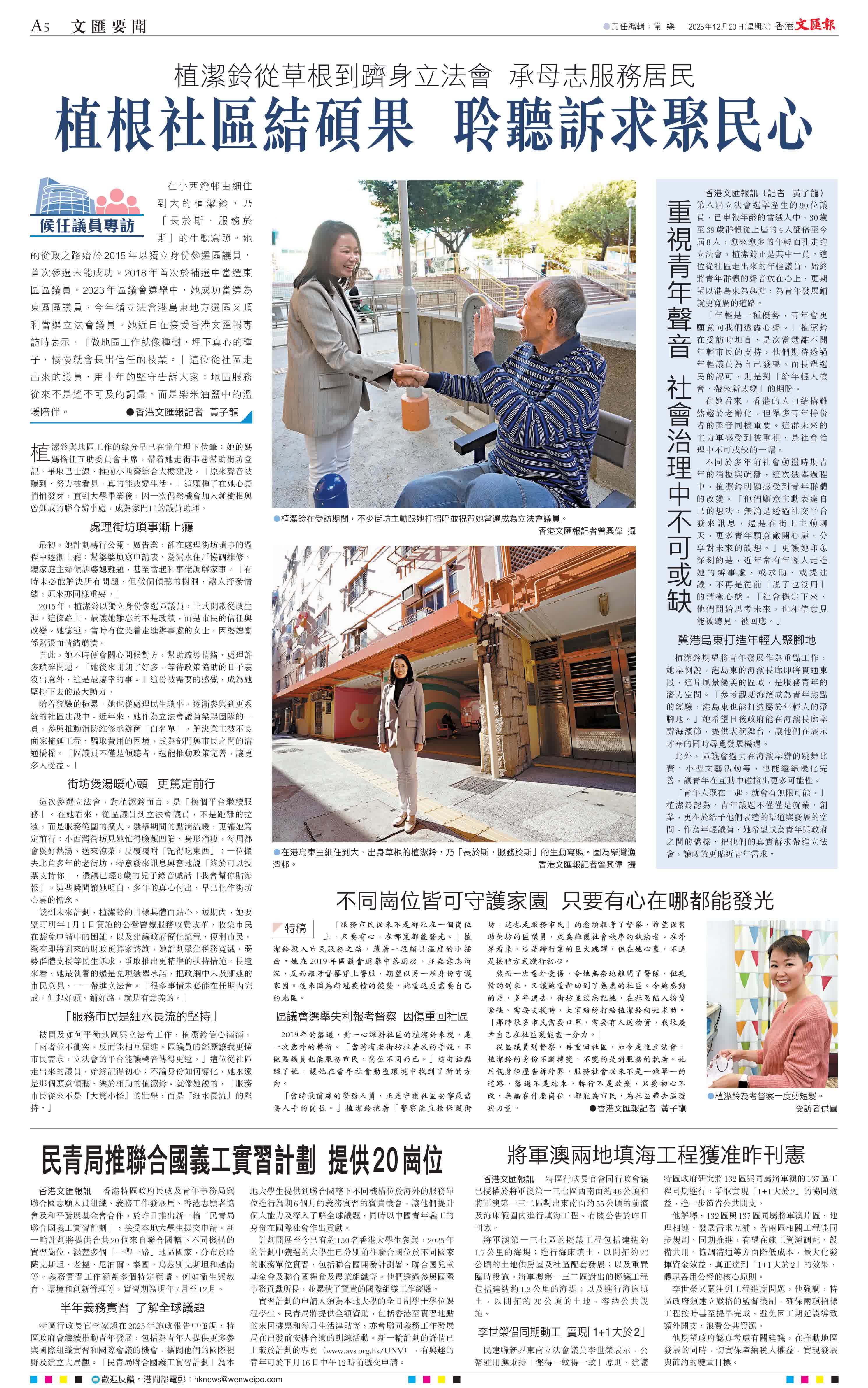 植潔鈴與地區工作的緣分早已在童年埋下伏筆:她的媽媽擔任互助委員會主席,帶着她走街串巷幫助街坊登記、爭取巴士線、推動小西灣綜合大樓建設。「原來聲音被聽到、努力被看見,真的能改變生活。」這顆種子在她心裏悄悄發芽,直到大學畢業後,因一次偶然機會加入鍾樹根與曾鈺成的聯合辦事處,成為家門口的議員助理。