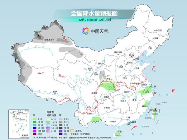 雨雪來去匆匆,明天中東部大部地區又將進入雨雪稀少模式。預計,新疆北部和南疆西部山區、西藏西北部、甘肅西北部和東南部、寧夏南部等地部分地區有小雪或雨夾雪,其中,新疆北部和南疆西部山區、西藏西北部等地部分地區有中到大雪,局地暴雪。陝西南部、湖北西部、四川東北部、重慶東北部、雲南東南部、江南東北部、福建東部、海南島、台灣島東部等地部分地區有小到中雨,其中,台灣島東北部局地有大雨。