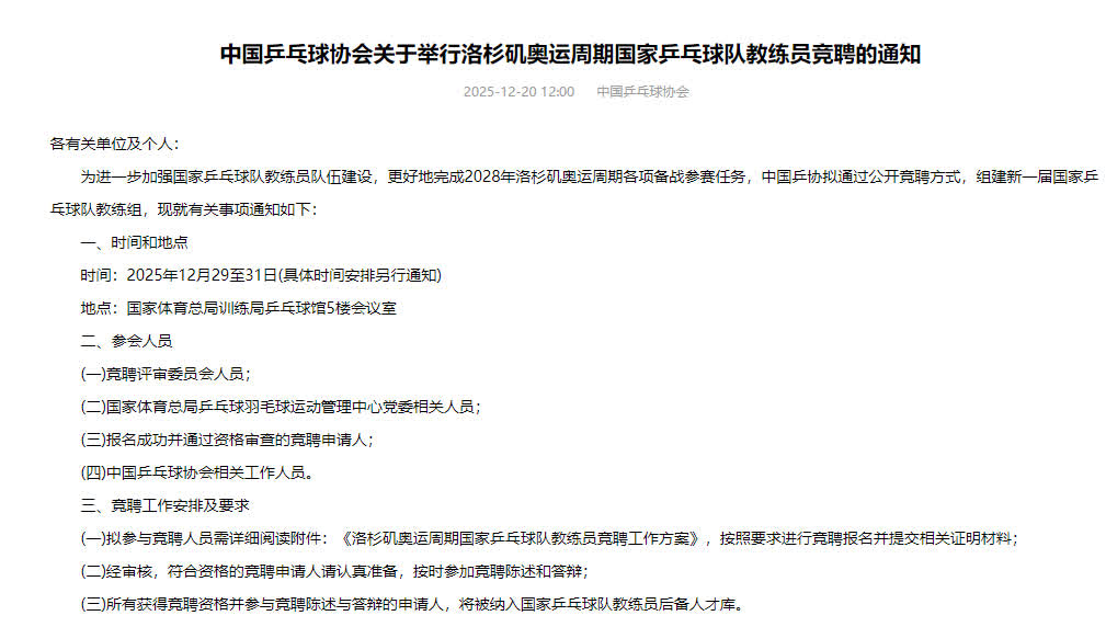 今天,中國乒乓球協會在官網發布《中國乒乓球協會關於舉行洛杉磯奧運周期國家乒乓球隊教練員競聘的通知》,正式啟動新周期國家隊教練員公開競聘工作。