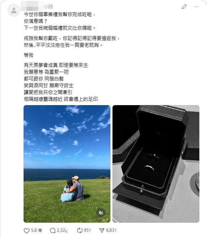 在帖文中,她亦上載二人在藍天白雲、天朗氣清下,在綠悠悠的草地上依偎並肩看風景的影片,另有一張展示婚戒的黑白照片。