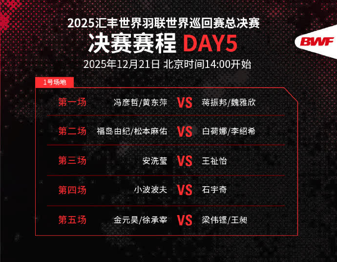 2025年世界羽聯年終總決賽今日進入第5個比賽日,5個單項將決出年終冠軍,中國隊在混雙、女單、男單、男雙4項中闖入決賽,力拚4金。