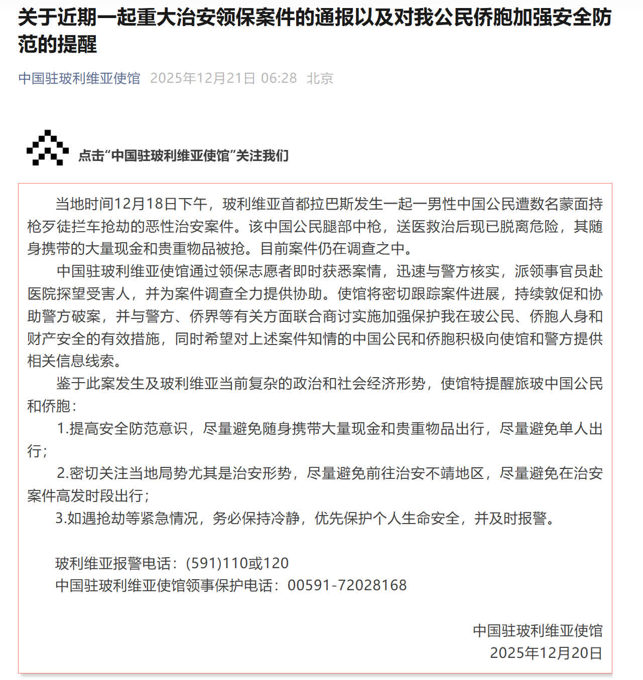 鑒於此案發生及玻利維亞當前複雜的政治和社會經濟形勢,使館特提醒旅玻中國公民和僑胞: