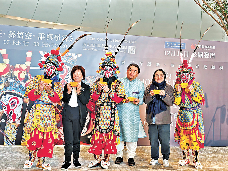 香港文匯報訊(記者 寧寧)京劇《美猴王·孫悟空·誰與爭鋒》將於2026年2月6日至8日在西九戲曲中心大劇院上演,日前主辦及受惠機構「智行基金會」與製作單位「趨勢教育基金會」特別選擇於戲曲中心中庭舉行新聞發布會,三代猴王同台亮相逐一登場演功架之前,先由劇中武場領奏高廷東及文場領奏許家銘現場協奏戲曲音樂為發布會暖身,頓時令戲曲中心熱鬧起來,就連外國遊客都被吸引住。