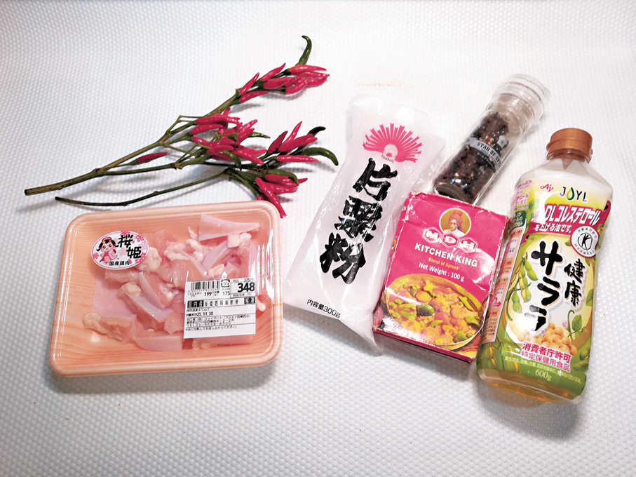 雞軟骨200克、片栗粉2湯匙、油200毫升、小米辣5克、咖喱粉少許、黑胡椒少許