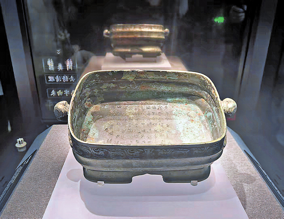 展覽中,西周遂公盨吸引了眾多參觀者的駐足。這件約2,900年前的食器,形狀恰似「飯盒」,高11.8厘米,口徑24.8厘米,重2.5千克。其橫截面呈橢方形,直口、束頸、腹壁近直、底接矮圈足,頸部飾對稱獸首雙耳,圈足四面正中有尖擴弧形缺口,口沿下飾一周長卷尾鳥紋紋飾帶,腹部飾瓦紋,腹內壁隨外壁瓦紋相應地作凹凸狀,工藝精湛,盡顯西周青銅器的典雅之美。