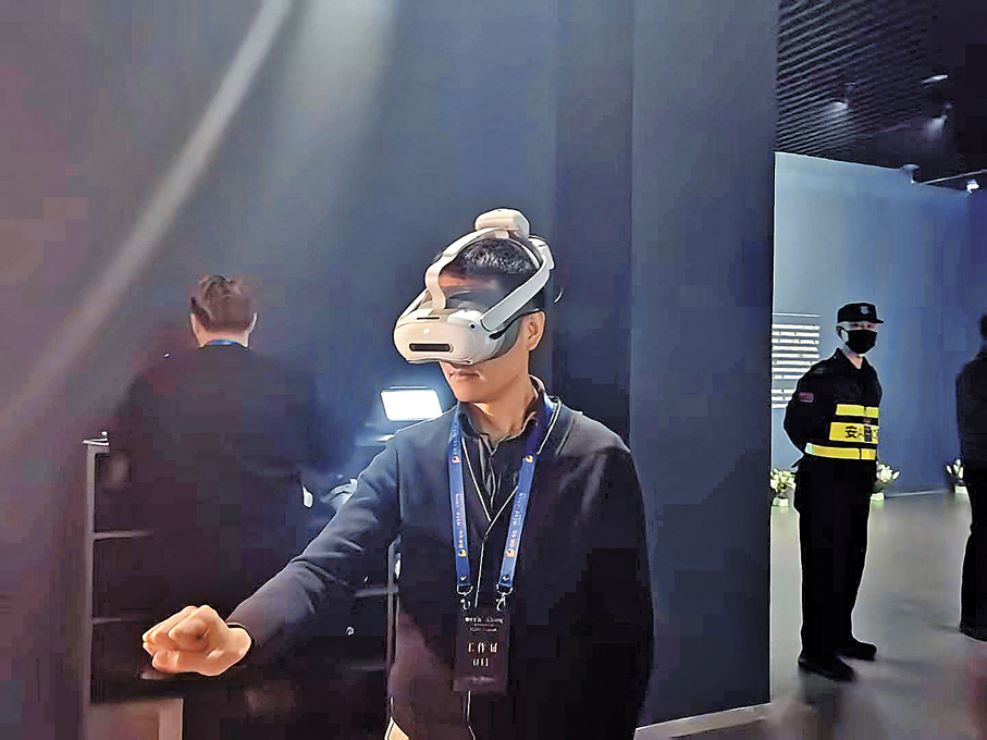 「抓到了,拼好了!」「哇,文物飛起來了!」在特展現場,青銅禮官大挑戰MR數字藝術體驗區,觀眾帶上眼鏡在全息動畫中沉浸式抓取國寶「神面卣」全息影像的各個部件,拼合組裝青銅器。