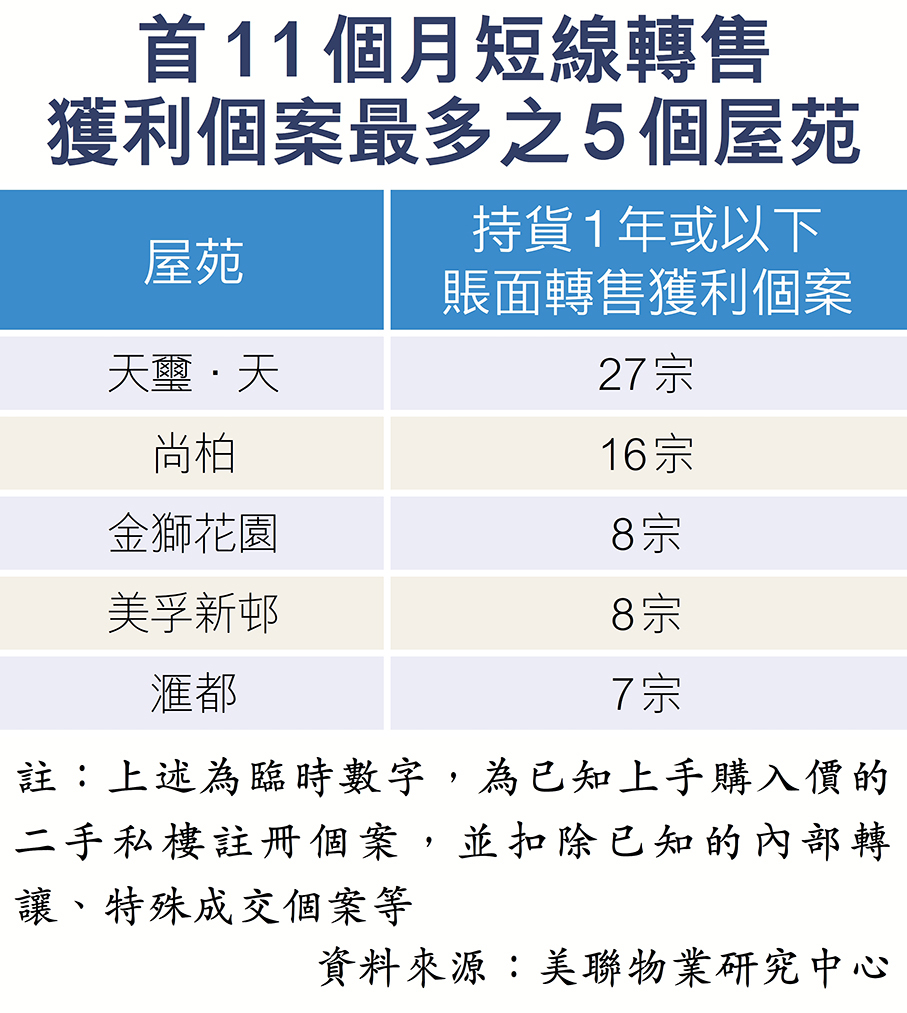 雖然短線轉售個案「明顯」增加,但主要因近年「基數」低;再者,若與今年首11個月已知上手購入價(扣除已知內部轉讓及特殊成交個案等)的二手私宅註冊個案共錄21,590宗相比,持貨年期1年或以下的轉售個案622宗,佔已知上手購入價的二手私宅註冊個案只有約2.9%,可見短線轉售活躍度雖然提升,但未現過熱跡象。