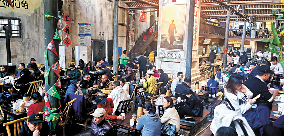 夜幕降臨,茶館亮起暖黃的燈,戲曲聲混着嘈雜聲飄出窗外。「在東茅街茶館,沒有淡季。」一位東茅街的老住戶李大爺說。從早點到夜宵,每天1.5萬客流讓這座老建築重獲新生。
