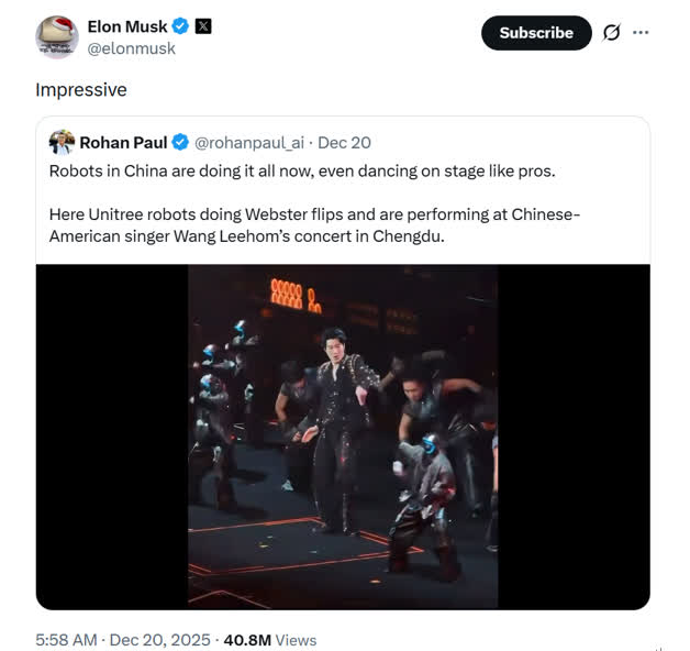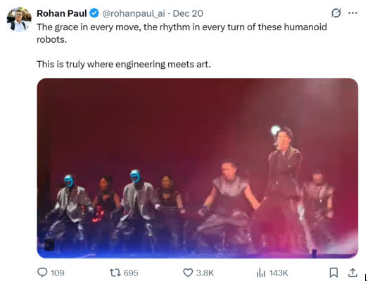 有網友讚嘆,「這些人形機器人的每一個動作的優雅,每一個轉身的節奏。這才是真正的工程與藝術的融合。」↓
