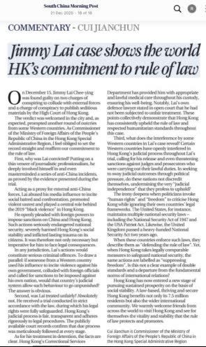 2025年12月21日,崔建春特派員在《南華早報》發表題為《關於黎智英案,你應該知道這些》的署名文章。全文如下: