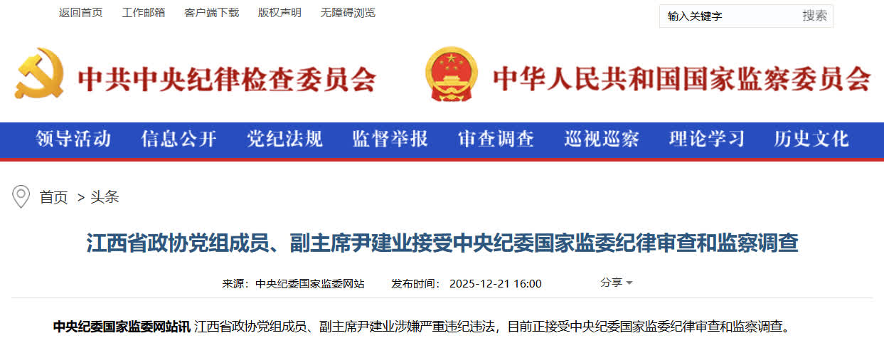 據中央紀委國家監委網站消息,江西省政協黨組成員、副主席尹建業涉嫌嚴重違紀違法,目前正接受中央紀委國家監委紀律審查和監察調查。