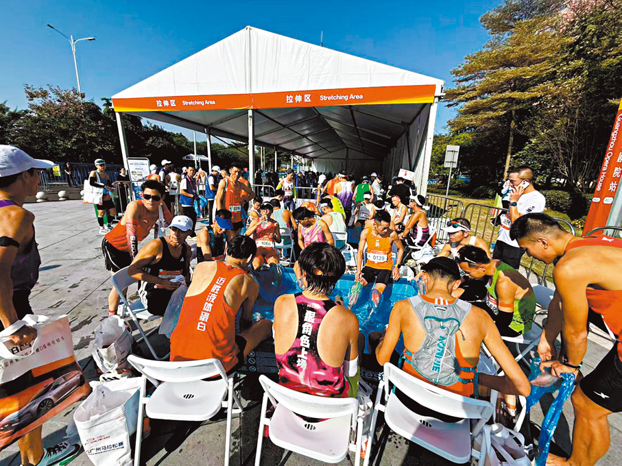 今次賽事服務亦有不少香港元素,由香港拉伸康復學會主席、輕鬆俠運動康復創始人王少輝領銜,帶領近200名拉伸康復師在廣馬現場為參賽選手提供服務。王少輝自2013年起,參與多屆廣州馬拉松的康復服務。