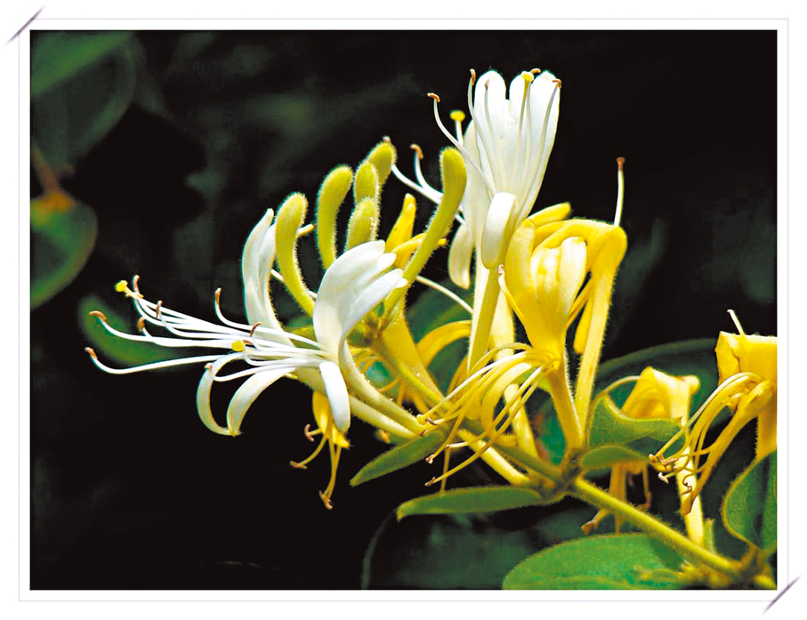 明代李時珍《本草綱目》中記載:「花初開者,蕊瓣俱色白,經二三日則色變黃。新舊相參,黃白相映,故呼金銀花。」初綻時皓白似雪,盛放後明黃如蜜,新舊相疊間,恰似金銀相照,靈動動人。作為攀援植物,它的枝蔓間更藏着浪漫密碼,一蒂雙花並生,花蕊探出瓣外,相依相偎,形影不離,宛如鴛鴦對舞,又得「鴛鴦藤」的溫柔別名。金銀花性甘寒、氣芳香,清熱而不傷胃,搭配甘草有清熱解毒、利咽潤喉的功效,常用於緩解感冒、咽喉腫痛等症狀,也可用於治療癰疽瘡瘍。