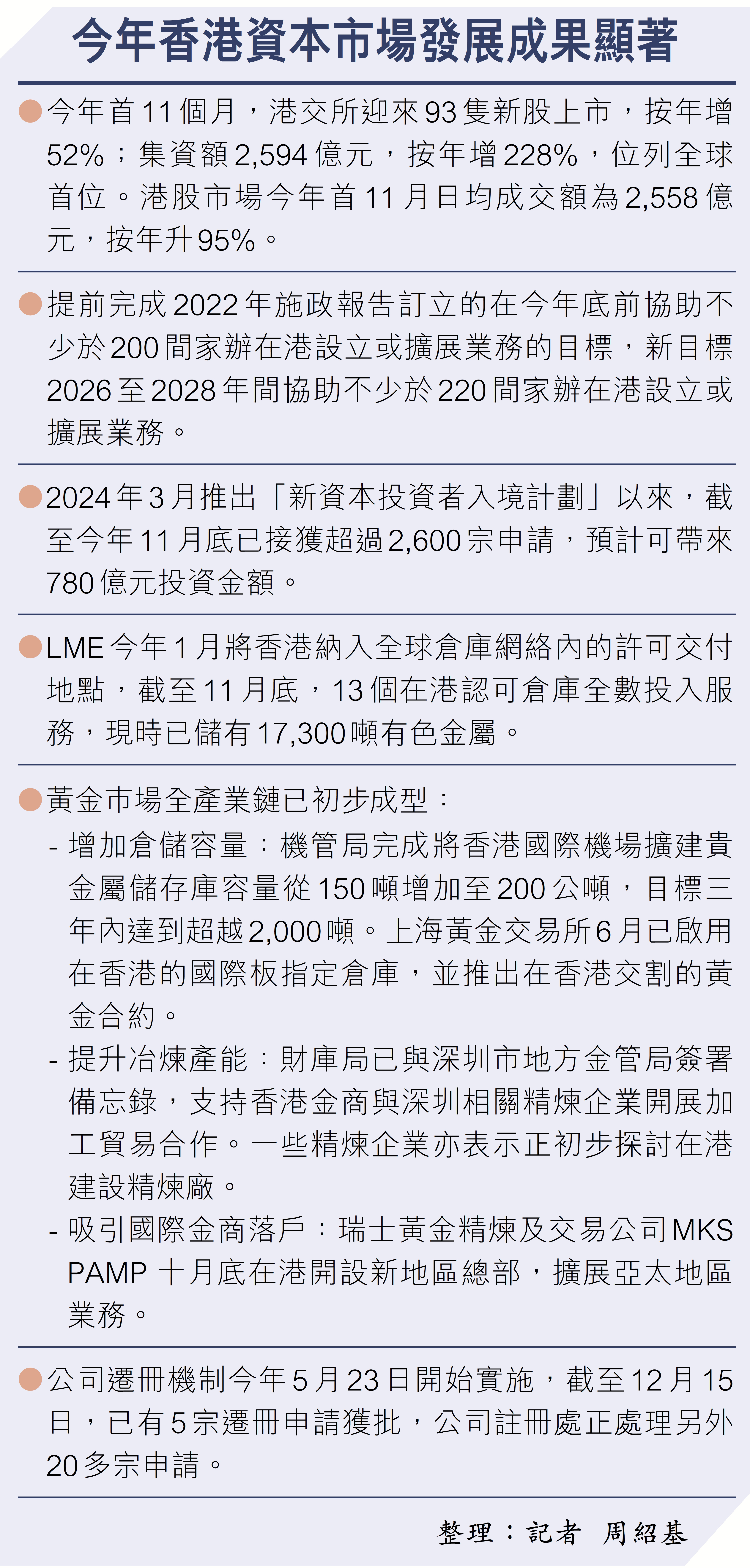 此外,過去兩年,本港一直積極推動大宗商品市場發展,並且有着一定的成績,最具體就是本港在今年初,港交所旗下倫敦金屬交易所(LME)將香港納入為其全球倉庫網絡內的認可交付地點,並開始接受倉庫營運商申請許可。截至11月底,LME 13個在港認可倉庫已全數投入服務,現時已儲有17,300噸有色金屬。許正宇形容有關措施,令本港在短短1年內,無論在倉儲及物流方面,都取得了「質變」。