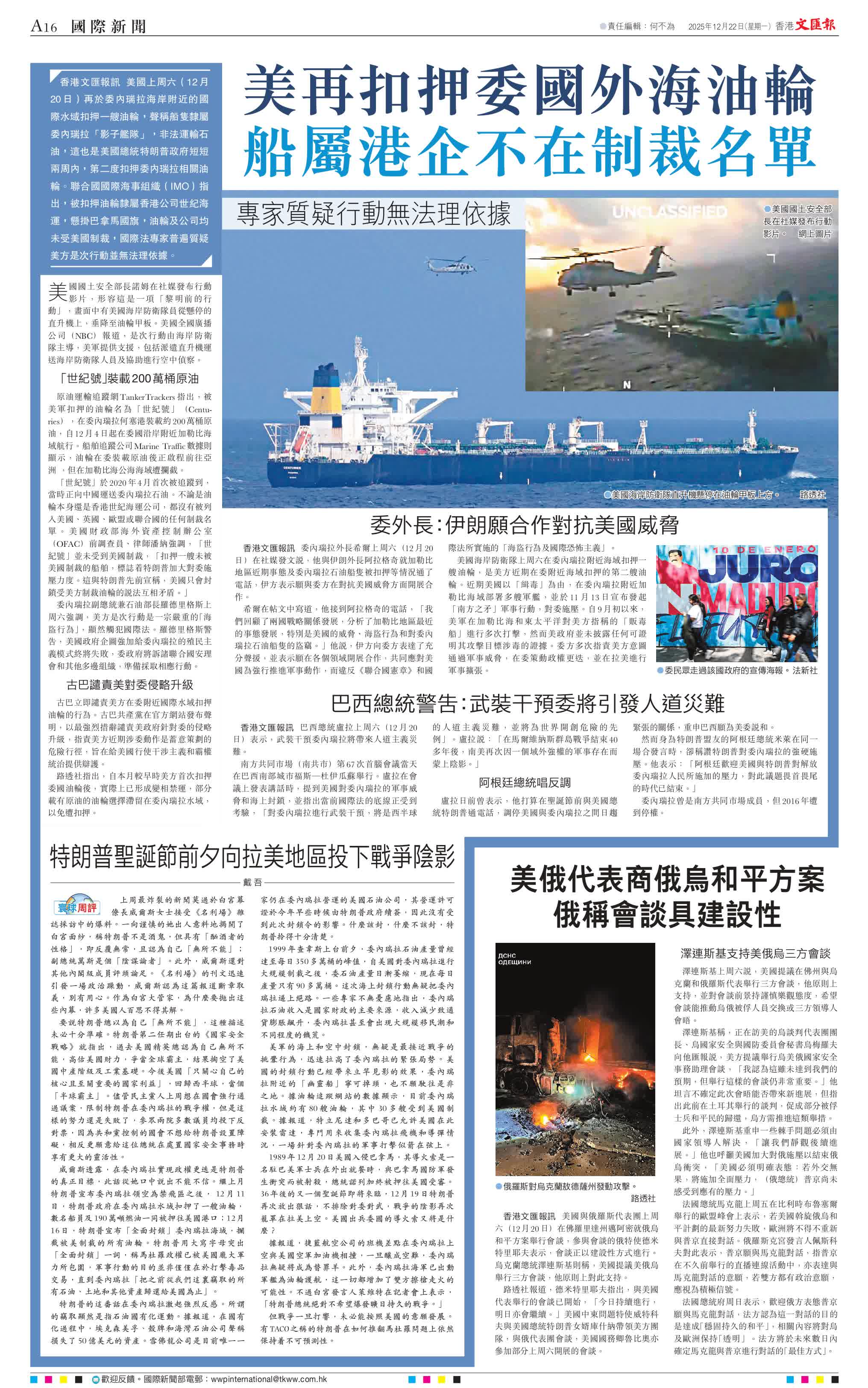 香港文匯報訊 美國上周六(12月20日)再於委內瑞拉海岸附近的國際水域扣押一艘油輪,聲稱船隻隸屬委內瑞拉「影子艦隊」,非法運輸石油,這也是美國總統特朗普政府短短兩周內,第二度扣押委內瑞拉相關油輪。聯合國國際海事組織(IMO)指出,被扣押油輪隸屬香港公司世紀海運,懸掛巴拿馬國旗,油輪及公司均未受美國制裁,國際法專家普遍質疑美方是次行動並無法理依據。