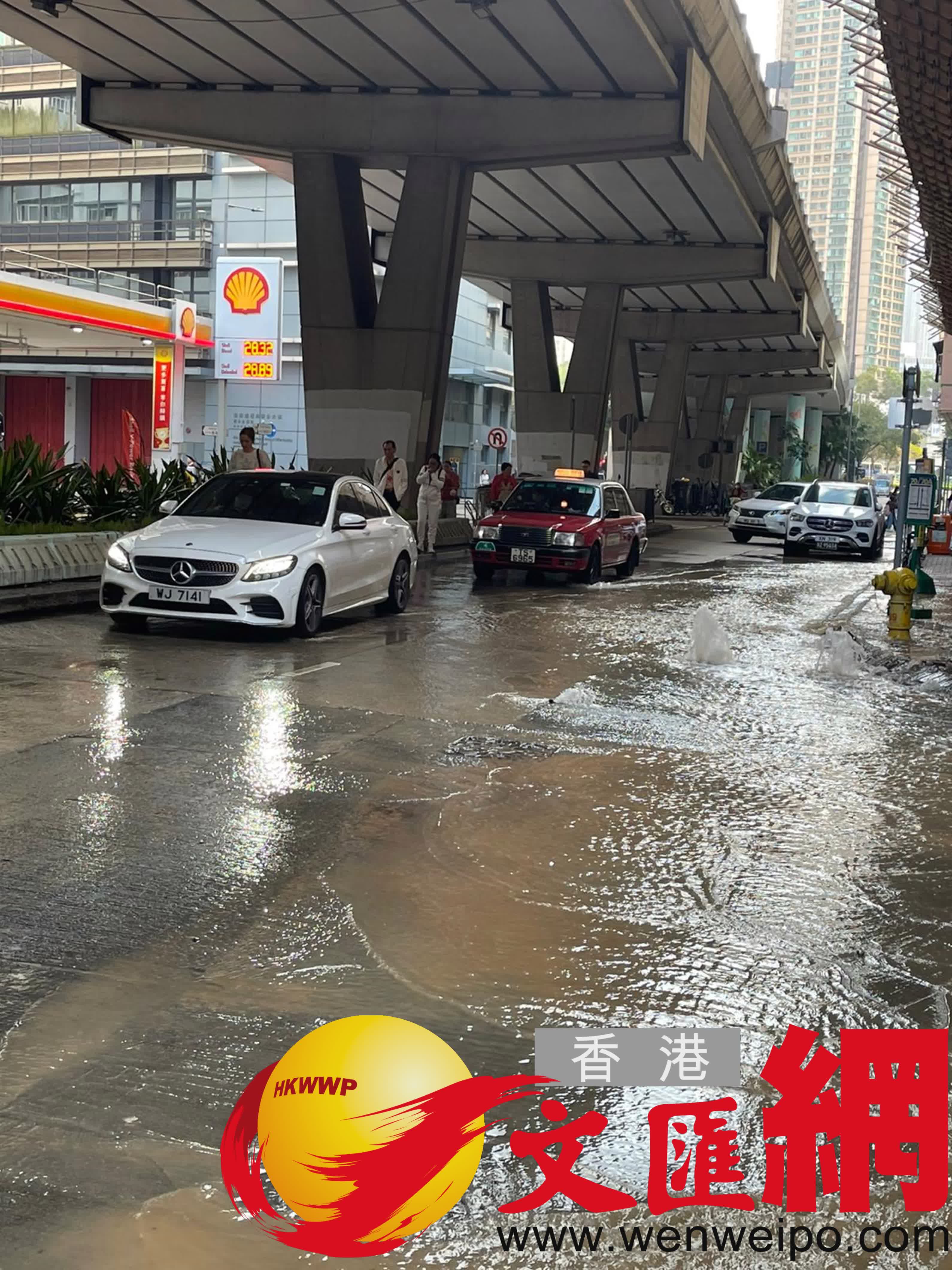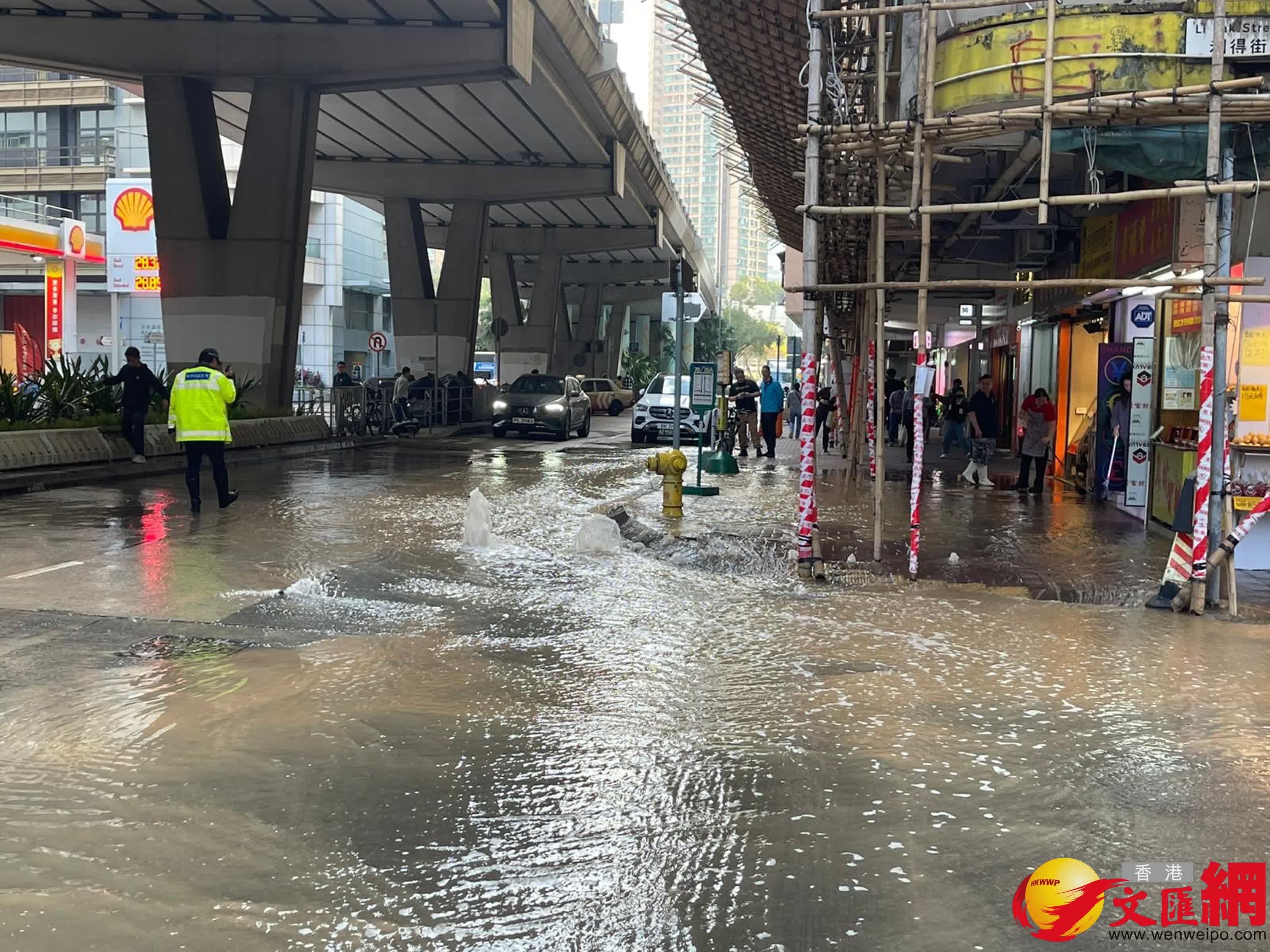 香港文匯報訊(記者 蕭景源)大角咀道與利得街交界路邊,今日(22日)下午有地底鹹水管爆裂,湧出水柱淹浸部分行人路及馬路,駛經車輛要涉水而行,部分途人要走出馬路中間石壆避開淹浸的路面,附近部分店舖亦受水浸影響,有職員在店門口不停掃除積水,警員則到場指揮交通及等候水務署派人關水掣。