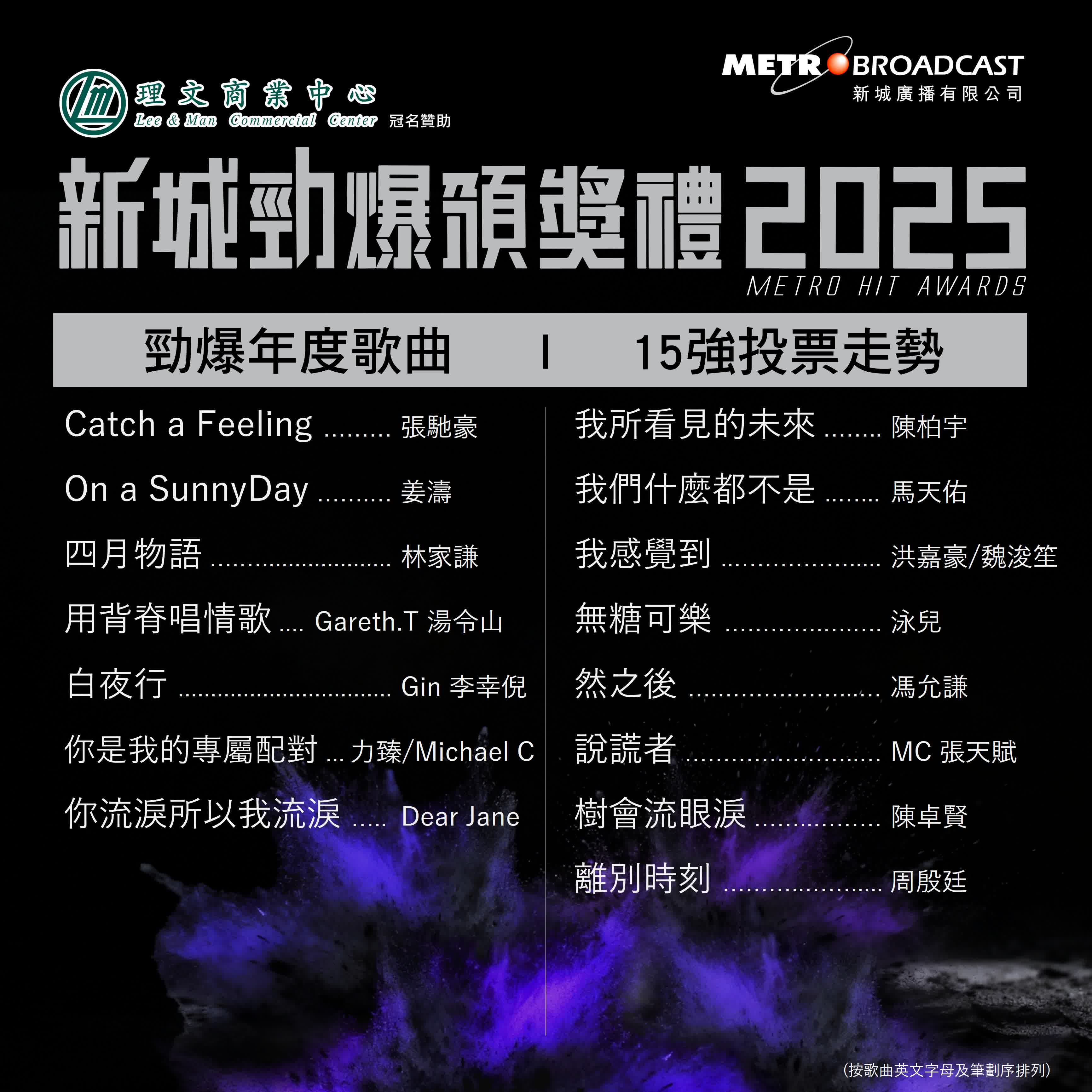 香港文匯報訊(記者 梁靜儀)一年一度的「新城勁爆頒獎禮 2025」,將於本月 27 日舉行;大會今天(22 日)公布了「勁爆年度歌曲」最終 15 強的入選名單。