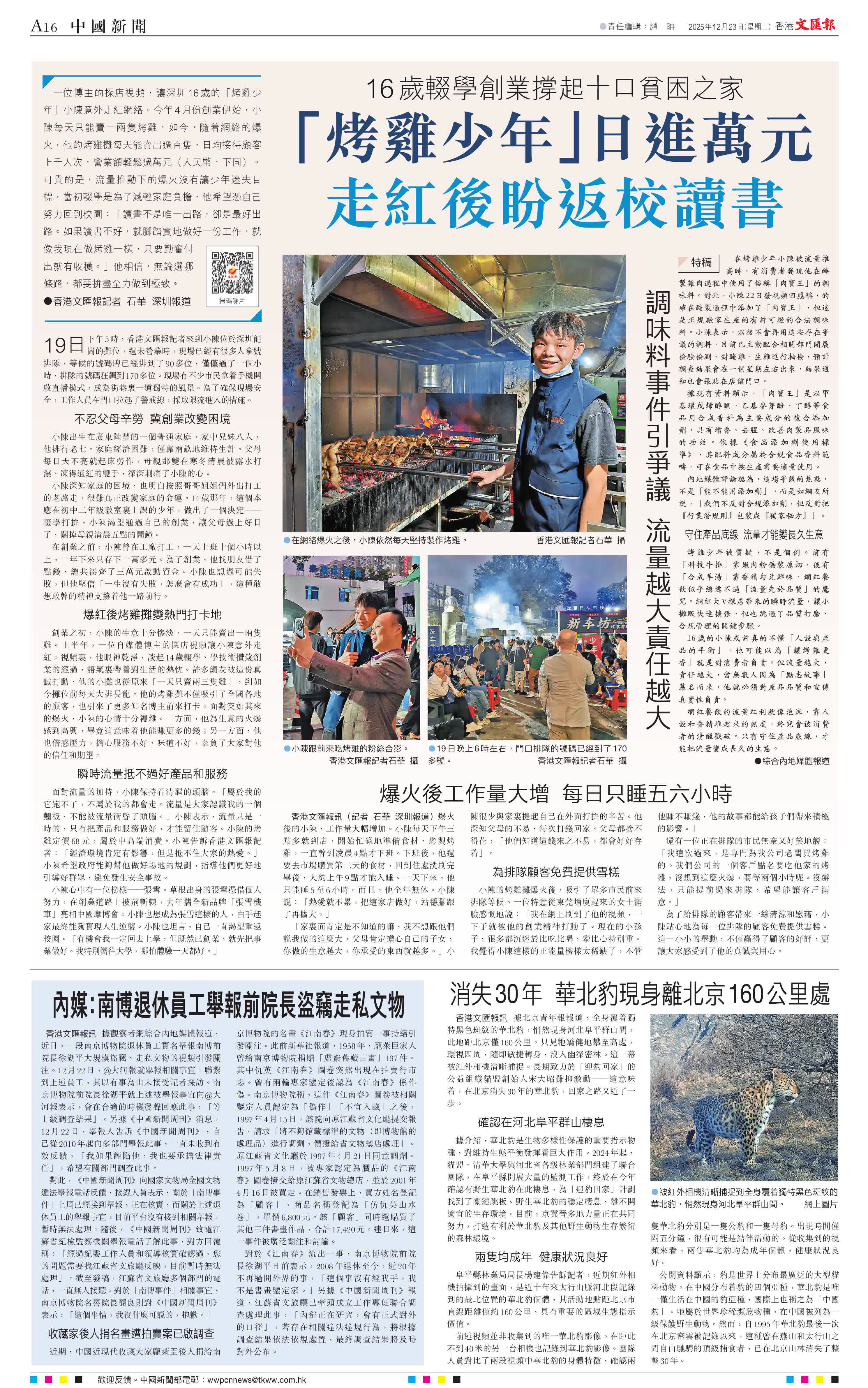 (香港文匯報記者 石華 深圳報道)一位博主的探店視頻,讓深圳16歲的「烤雞少年」小陳意外走紅網絡。今年4月份創業伊始,小陳每天只能賣一兩隻烤雞,如今,隨着網絡的爆火,他的烤雞攤每天能賣出過百隻,日均接待顧客上千人次,營業額輕鬆過萬元(人民幣,下同)。可貴的是,流量推動下的爆火沒有讓少年迷失目標,當初輟學是為了減輕家庭負擔,他希望憑自己努力回到校園:「讀書不是唯一出路,卻是最好出路。如果讀書不好,就腳踏實地做好一份工作,就像我現在做烤雞一樣,只要勤奮付出就有收穫。」他相信,無論選哪條路,都要拚盡全力做到極致。