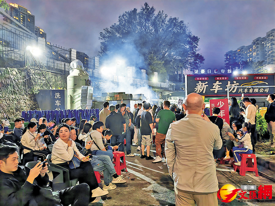 19日下午5時,香港文匯報記者來到小陳位於深圳龍崗的攤位,還未營業時,現場已經有很多人拿號排隊,等候的號碼牌已經排到了90多位,僅僅過了一個小時,排隊的號碼狂飆到170多位。現場有不少市民拿着手機開啟直播模式,成為街巷裏一道獨特的風景。為了確保現場安全,工作人員在門口拉起了警戒線,採取限流進入的措施。