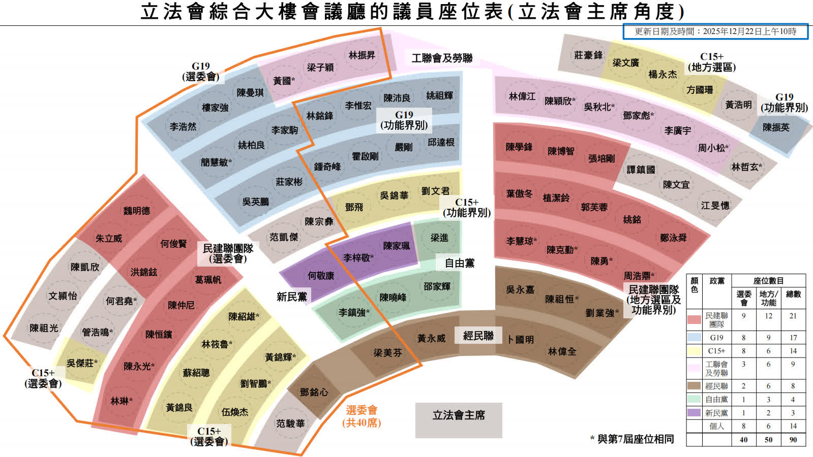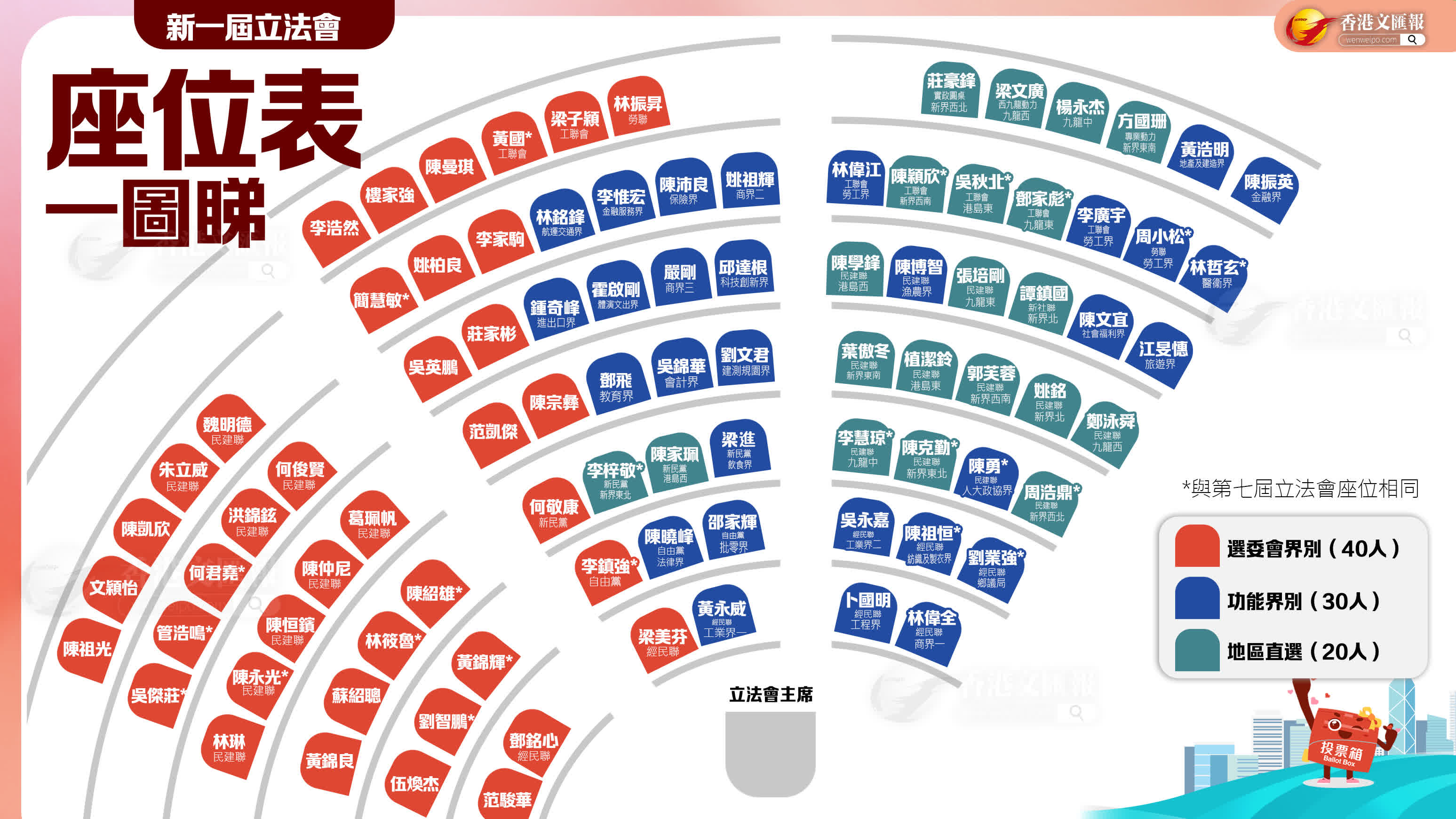 香港特區第八屆立法會選舉圓滿結束,新一屆立法會90個議席「大執位」,當選議員近半屬「新丁」。第八屆立法會議員座位表顯示,連任的50名議員中,只有逾20人座位未變,各政黨佔據的「地盤」則未有明顯變動,40名選委會界別議員照舊由主席左側坐至中間,各大政黨按照界別「坐埋一齊」,不過有個別議員的座位耐人尋味。