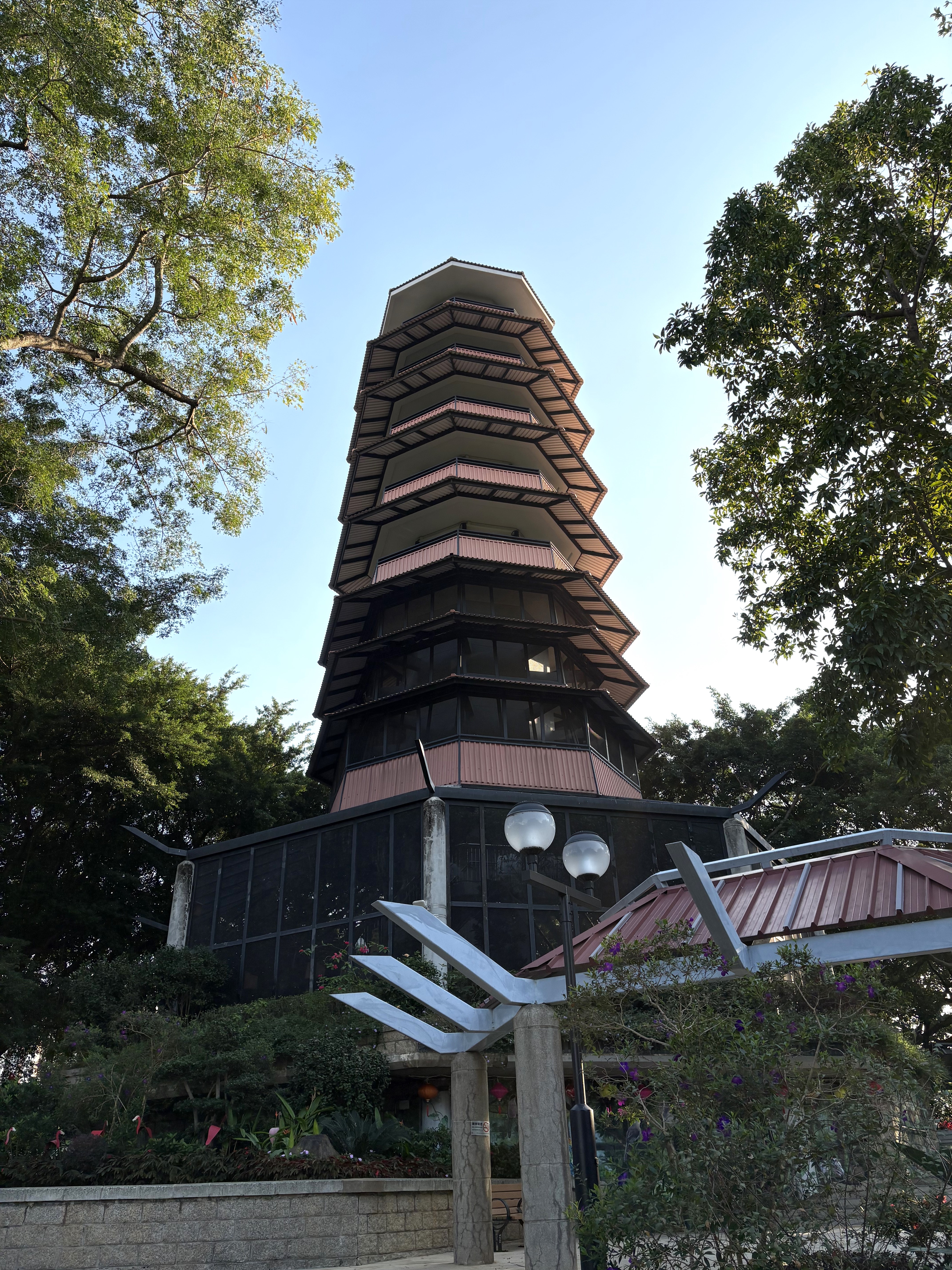 百鳥塔外能聽見悅耳的流水聲,跟隨聲音來到百鳥塔下方的瀑布,一道13米高的水流飛瀉而下,激起清涼的水花,而後匯入人工湖中。比起瀑布的水花四濺,人工湖則很平靜,水清而淺,湖中的魚和龜清晰可見。今日陽光正好,有兩隻龜正趴在乾燥的石面上享受日光,還伸長脖子左顧右盼,很有活力。
