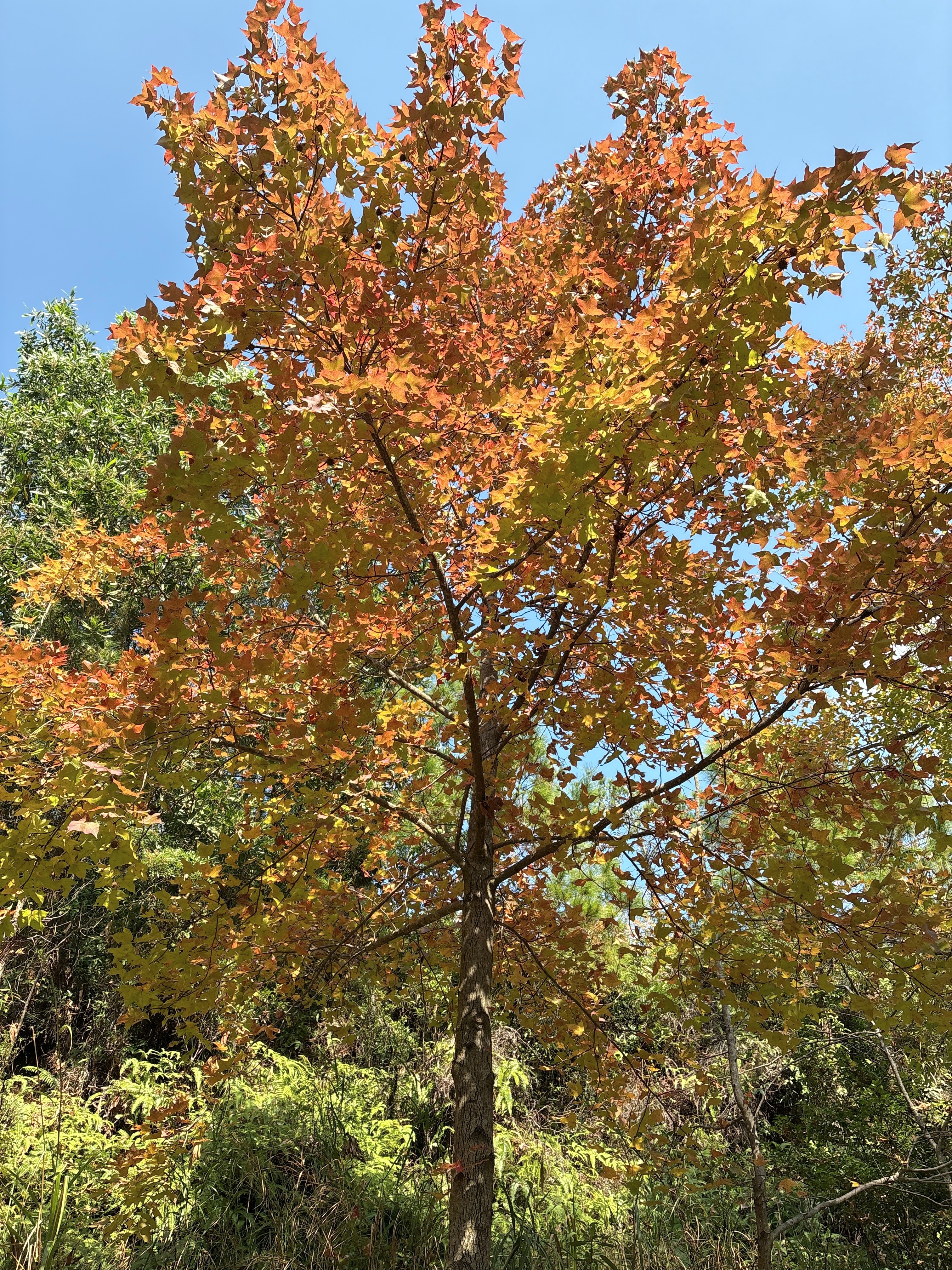 由港鐵朗屏站B2出口離開,落天橋後可到達巴士朗屏邨悅屏樓站,在此搭乘K66巴士前往大棠山道。另外,由即日起至1月11日,逢周六、日及公眾假期會加開特別班次K66A。沿大棠山道步行進入大欖郊野公園,爬上一段陡峭的石梯,便可來到一處開闊的燒烤場。這裏有洗手間和小商店可供補給,站在欄杆邊向下望,山坡上是一片綠油油的草地,遠處的高樓井然有序,呼吸着新鮮的山風,感到心曠神怡。路標顯示,燒烤場距楓香林仍有2公里,需要約30分鐘才能到達。繼續暴走,途中已經可見不少楓樹染上紅黃交織的色彩,雖然旁邊的樹仍是綠色,沒有連成一片,但在綠的襯托下,紅葉才更加絢爛。
