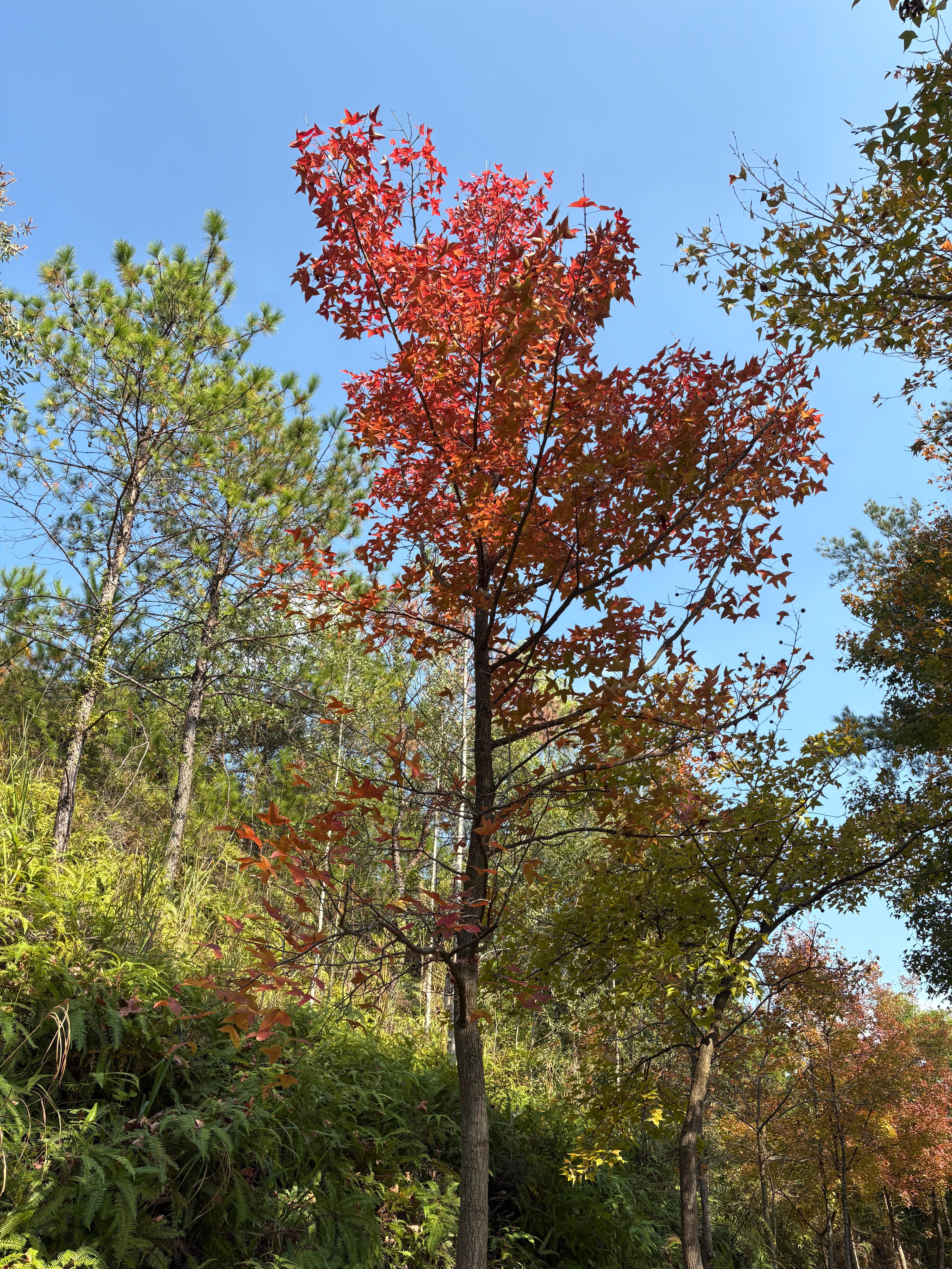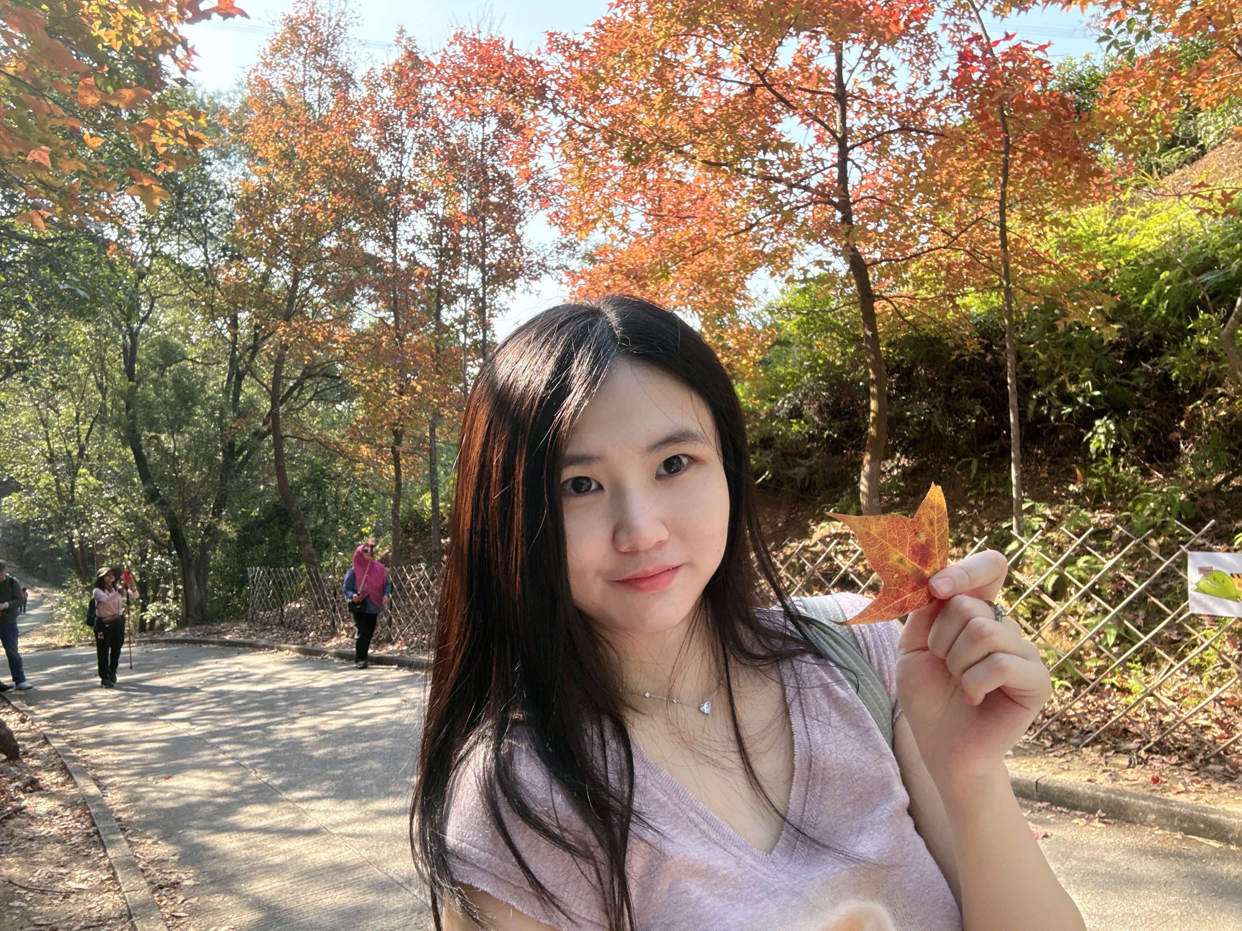 不時有大風吹過,落葉打着旋翩翩落下,是專屬這個時節的浪漫。有不少遊客在紅葉下擺出各種姿勢拍照打卡,更拾起落葉做裝飾。行完整片楓香林,慳妹觀察到目前楓葉仍在次第變紅,想要欣賞到漫山紅遍的盛況,建議參考大欖郊野公園楓香林紅葉情報再決定前往。