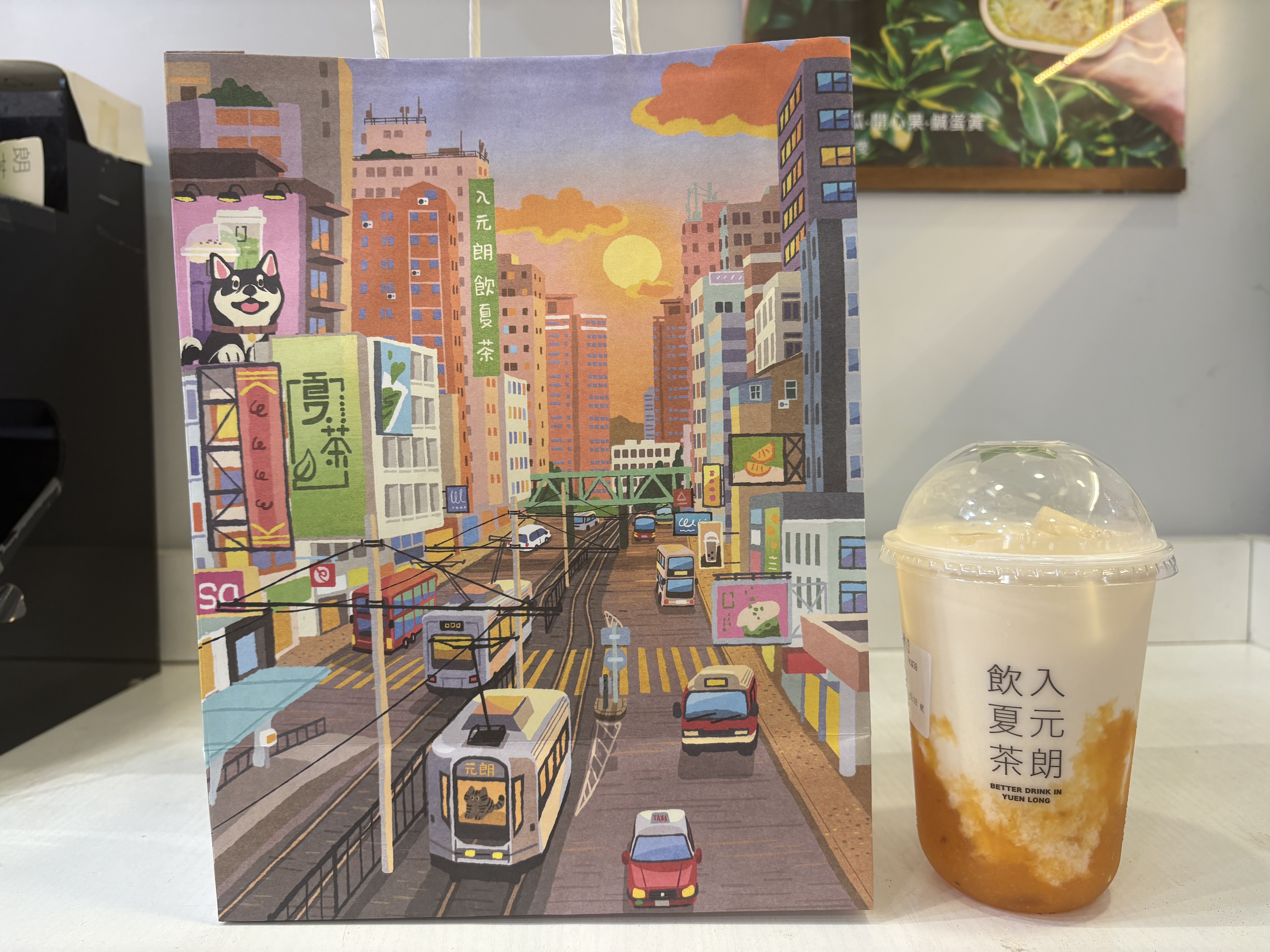 成日聽人講「入元朗,飲夏茶」,沒想到夏茶旁邊就是入選米芝蓮必比登推介的元朗香蕉仔,當然要一起試試。夏茶以開心果金珠鮮奶聞名,不過慳妹選擇了秋冬限定的柿柿奶綠。整杯茶飲以鮮奶綠加足量軟柿,香甜的果肉與奶香交織,還有QQ彈彈的寒天,口感清新。夏茶的另一特色是包裝紙袋,慳妹拿到的袋子上印有精美的元朗插畫,更有元朗楓葉紙袋,很有紀念意義。
