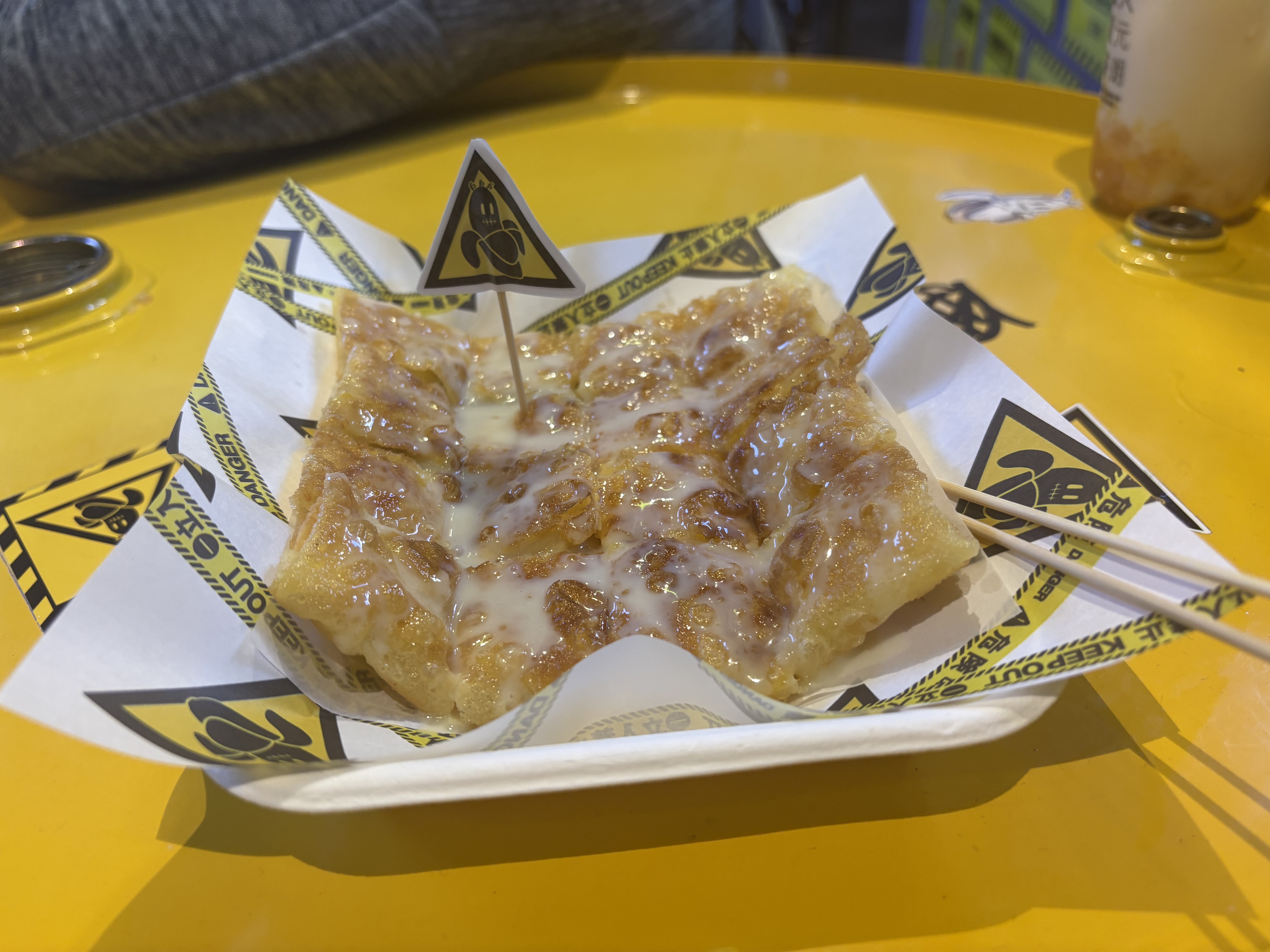 有了飲品,慳妹又去「香蕉仔」點了一份35元的煉奶香蕉煎餅,這款沒有太多濃味醬料,只有香蕉、雞蛋和煉奶。隔着玻璃看老闆製作,超薄超韌的餅皮已經看得人口水直流,夾上香蕉,淋滿煉奶,能想像到入口有多酥脆。煎餅到手一定要趁熱享用,咬開脆皮,濃郁的香蕉餡在口中爆開,再飲一啖柿柿奶綠,甜蜜又邪惡。