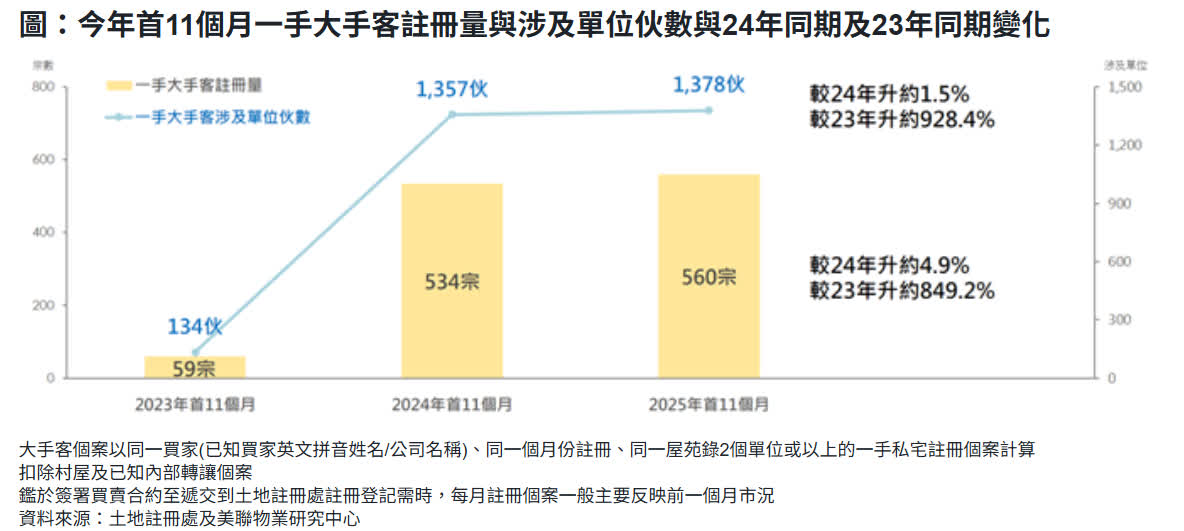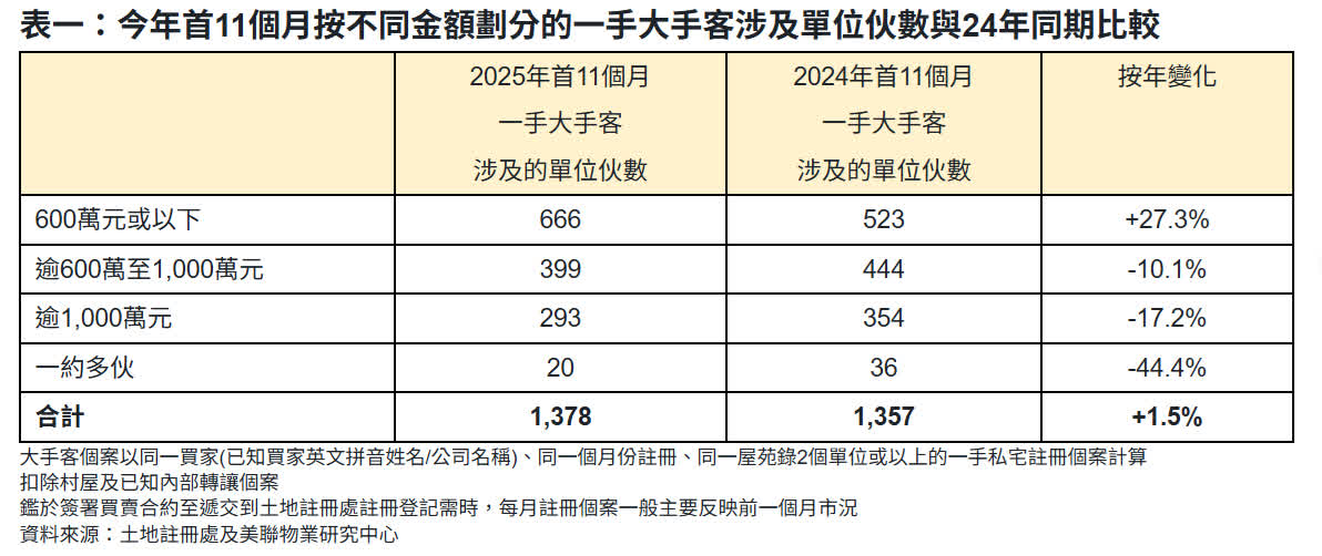 按涉及單位計算,今年首11個月一手大手客共涉及約1,378伙,按年增加約1.5%,比起2023年同期大升近9.3倍(見圖)。